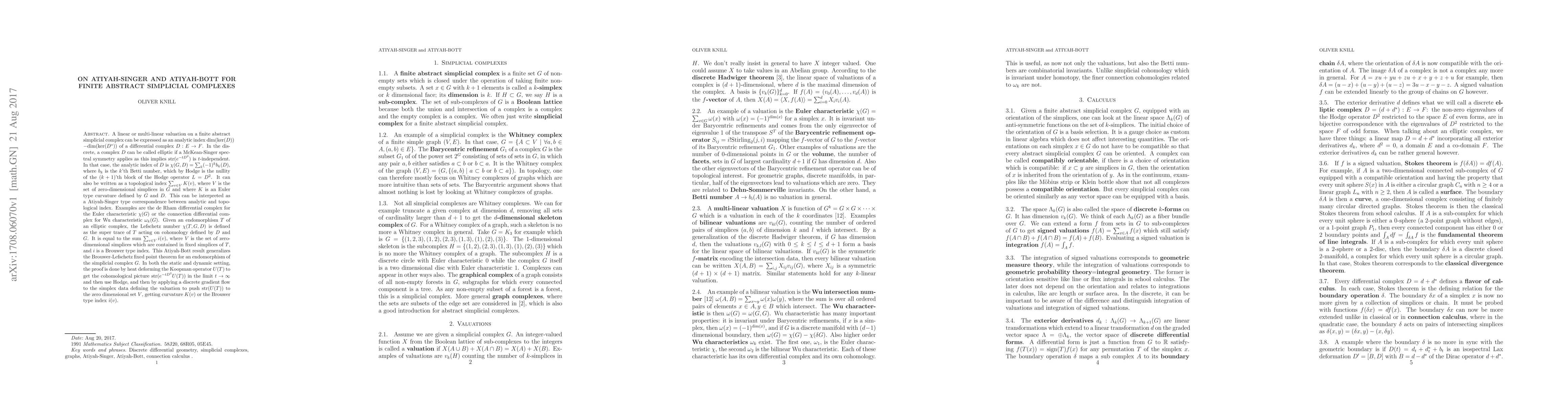 A linear or multi-linear valuation on a finite abstract simplicial complex can be expressed as an analytic index dim(ker(D)) -dim(ker(D^*)) of a differential complex D:E -> F. In the discrete, a complex D can be called elliptic if a McKean-Singer spectral symmetry applies as this implies str(exp(-t D^2)) is t-independent. In that case, the analytic index of D is the sum of (-1)^k b_k(D), where b_k(D) is the k'th Betti number, which by Hodge is the nullity of the (k+1)'th block of the Hodge operator L=D^2. It can also be written as a topological index summing K(v) over the set of zero-dimensional simplices in G and where K is an Euler type curvature defined by G and D. This can be interpreted as a Atiyah-Singer type correspondence between analytic and topological index. Examples are the de Rham differential complex for the Euler characteristic X(G) or the connection differential complex for Wu characteristic w_k(G). Given an endomorphism T of an elliptic complex, the Lefschetz number X(T,G,D) is defined as the super trace of T acting on cohomology defined by E. It is equal to the sum i(v) over V which are contained in fixed simplices of T, and i is a Brouwer type index. This Atiyah-Bott result generalizes the Brouwer-Lefschetz fixed point theorem for an endomorphism of the simplicial complex G. In both the static and dynamic setting, the proof is done by heat deforming the Koopman operator U(T) to get the cohomological picture str(exp(-t D^2) U(T)) in the limit t to infinity and then use Hodge, and then by applying a discrete gradient flow to the simplex data defining the valuation to push str(U(T)) to V, getting curvature K(v) or the Brouwer type index i(v).