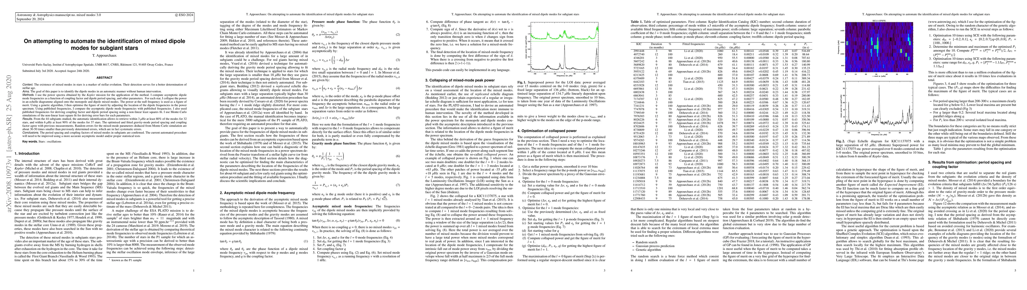 The existence of mixed modes in stars is a marker of stellar evolution. Their detection serves for a better determination of stellar age. The goal of this paper is to identify the dipole modes in an automatic manner without human intervention. I use the power spectra obtained by the Kepler mission for the application of the method. I compute asymptotic dipole mode frequencies as a function of coupling factor and dipole period spacing, and other parameters. For each star, I collapse the power in an echelle diagramme aligned onto the monopole and dipole mixed modes. The power at the null frequency is used as a figure of merit. Using a genetic algorithm, I then optimise the figure of merit by adjusting the location of the dipole frequencies in the power spectrum}. Using published frequencies, I compare the asymptotic dipole mode frequencies with published frequencies. I also used published frequencies for deriving coupling factor and dipole period spacing using a non-linear least squares fit. I use Monte-Carlo simulations of the non-linear least square fit for deriving error bars for each parameters. From the 44 subgiants studied, the automatic identification allows to retrieve within 3 $\mu$Hz at least 80\% of the modes for 32 stars, and within 6 $\mu$Hz at least 90% of the modes for 37 stars. The optimised and fitted gravity-mode period spacing and coupling factor agree with previous measurements. Random errors for the mixed-mode parameters deduced from Monte-Carlo simulation are about 30-50 times smaller than previously determined errors, which are in fact systematic errors. The period spacing and coupling factors of mixed modes in subgiants are confirmed. The current automated procedure will need to be improved using a more accurate asymptotic model and/or proper statistical tests.