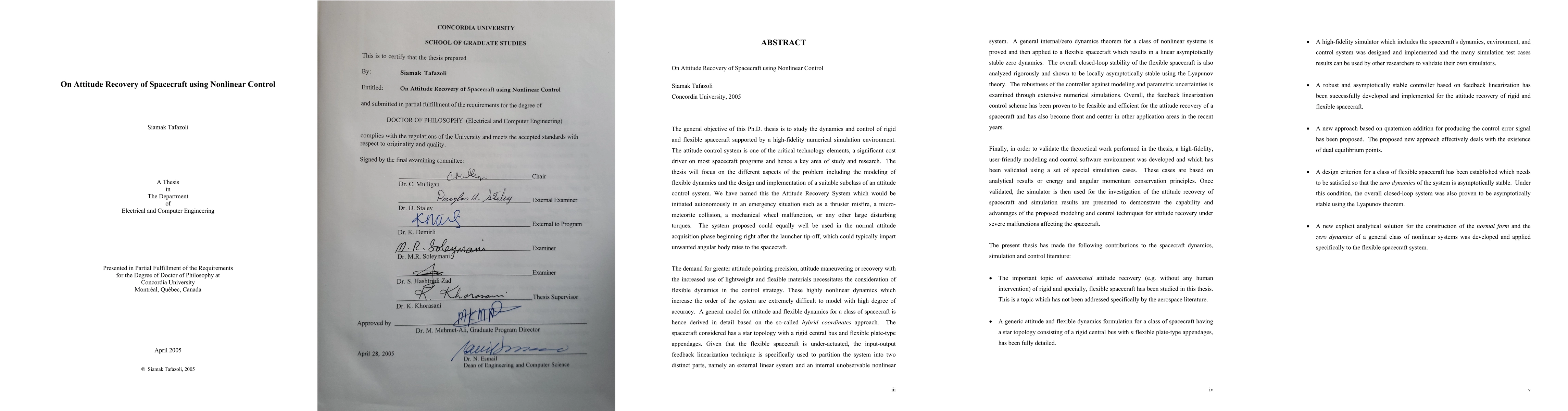 The general objective of this Ph.D. thesis is to study the dynamics and control of rigid and flexible spacecraft supported by a high-fidelity numerical simulation environment. The demand for greater attitude pointing precision, attitude maneuvering or recovery with the increased use of lightweight and flexible materials necessitates the consideration of flexible dynamics in the control strategy. These highly nonlinear dynamics which increase the order of the system are extremely difficult to model with high degree of accuracy. A general model for attitude and flexible dynamics for a class of spacecraft is hence derived in detail based on the so-called hybrid coordinates approach. The spacecraft considered has a star topology with a rigid central bus and flexible plate-type appendages. Given that the flexible spacecraft is under-actuated, the input-output feedback linearization technique is specifically used to partition the system into two distinct parts, namely an external linear system and an internal unobservable nonlinear system. A general internal/zero dynamics theorem for a class of nonlinear systems is proved and then applied to a flexible spacecraft which results in a linear asymptotically stable zero dynamics. The overall closed-loop stability of the flexible spacecraft is also analyzed rigorously and shown to be locally asymptotically stable using the Lyapunov theory. The robustness of the controller against modeling and parametric uncertainties is examined through extensive numerical simulations. Overall, the feedback linearization control scheme has been proven to be feasible and efficient for the attitude recovery of a spacecraft and has also become front and center in other application areas in the recent years.