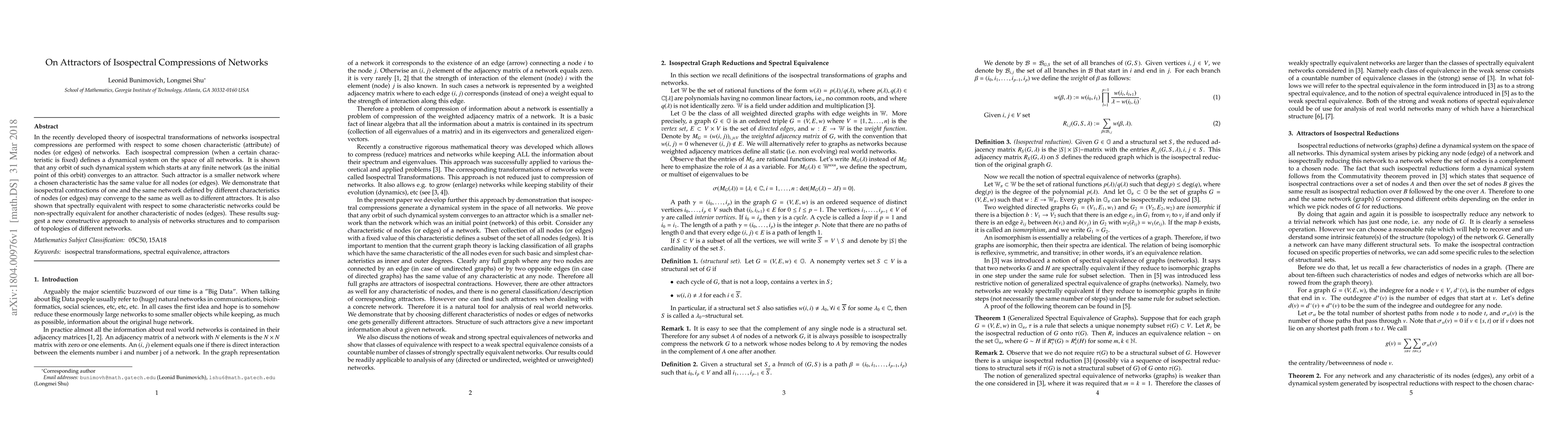 In the recently developed theory of isospectral transformations of networks isospectral compressions are performed with respect to some chosen characteristic (attribute) of nodes (or edges) of networks. Each isospectral compression (when a certain characteristic is fixed) defines a dynamical system on the space of all networks. It is shown that any orbit of such dynamical system which starts at any finite network (as the initial point of this orbit) converges to an attractor. Such attractor is a smaller network where a chosen characteristic has the same value for all nodes (or edges). We demonstrate that isospectral contractions of one and the same network defined by different characteristics of nodes (or edges) may converge to the same as well as to different attractors. It is also shown that spectrally equivalent with respect to some characteristic networks could be non-spectrally equivalent for another characteristic of nodes (edges). These results suggest a new constructive approach to analysis of networks structures and to comparison of topologies of different networks.
