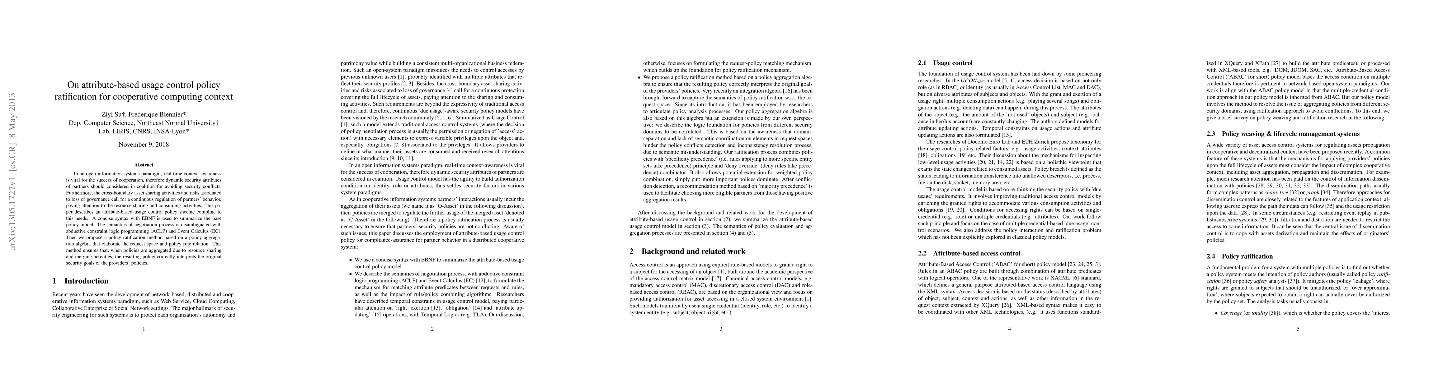 In an open information systems paradigm, real-time context-awareness is vital for the success of cooperation, therefore dynamic security attributes of partners should considered in coalition for avoiding security conflicts. Furthermore, the cross-boundary asset sharing activities and risks associated to loss of governance call for a continuous regulation of partners' behavior, paying attention to the resource sharing and consuming activities. This paper describes an attribute-based usage control policy shceme compline to this needs. A concise syntax with EBNF is used to summarize the base policy model. The semantics of negotiation process is disambiguated with abductive constraint logic programming (ACLP) and Event Calculus (EC). Then we propose a policy ratification method based on a policy aggregation algebra that elaborate the request space and policy rule relation. This method ensures that, when policies are aggregated due to resource sharing and merging activities, the resulting policy correctly interprets the original security goals of the providers' policies.