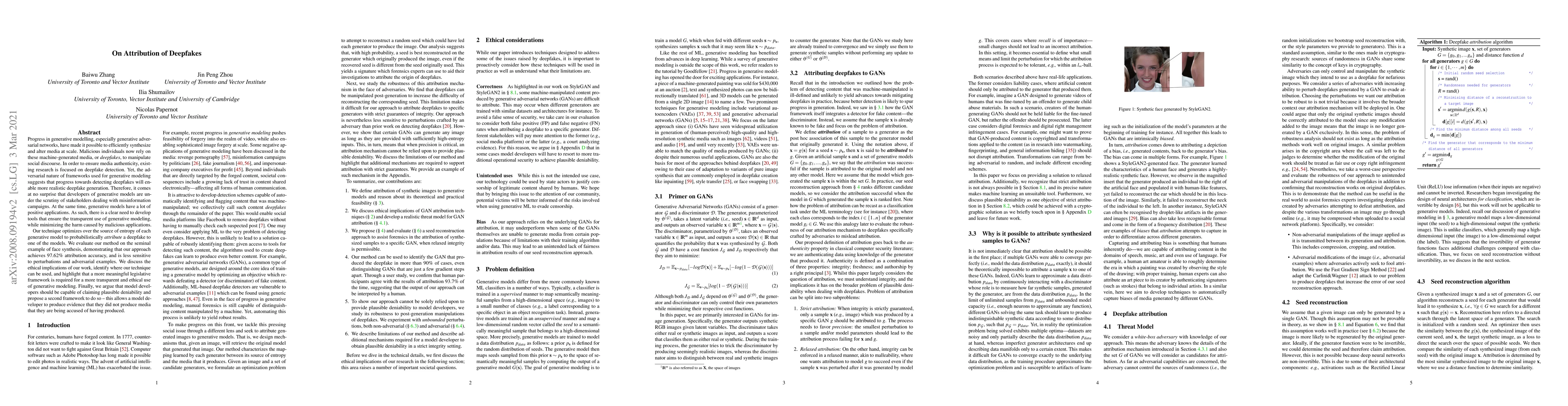 Progress in generative modelling, especially generative adversarial networks, have made it possible to efficiently synthesize and alter media at scale. Malicious individuals now rely on these machine-generated media, or deepfakes, to manipulate social discourse. In order to ensure media authenticity, existing research is focused on deepfake detection. Yet, the adversarial nature of frameworks used for generative modeling suggests that progress towards detecting deepfakes will enable more realistic deepfake generation. Therefore, it comes at no surprise that developers of generative models are under the scrutiny of stakeholders dealing with misinformation campaigns. At the same time, generative models have a lot of positive applications. As such, there is a clear need to develop tools that ensure the transparent use of generative modeling, while minimizing the harm caused by malicious applications. Our technique optimizes over the source of entropy of each generative model to probabilistically attribute a deepfake to one of the models. We evaluate our method on the seminal example of face synthesis, demonstrating that our approach achieves 97.62% attribution accuracy, and is less sensitive to perturbations and adversarial examples. We discuss the ethical implications of our work, identify where our technique can be used, and highlight that a more meaningful legislative framework is required for a more transparent and ethical use of generative modeling. Finally, we argue that model developers should be capable of claiming plausible deniability and propose a second framework to do so -- this allows a model developer to produce evidence that they did not produce media that they are being accused of having produced.