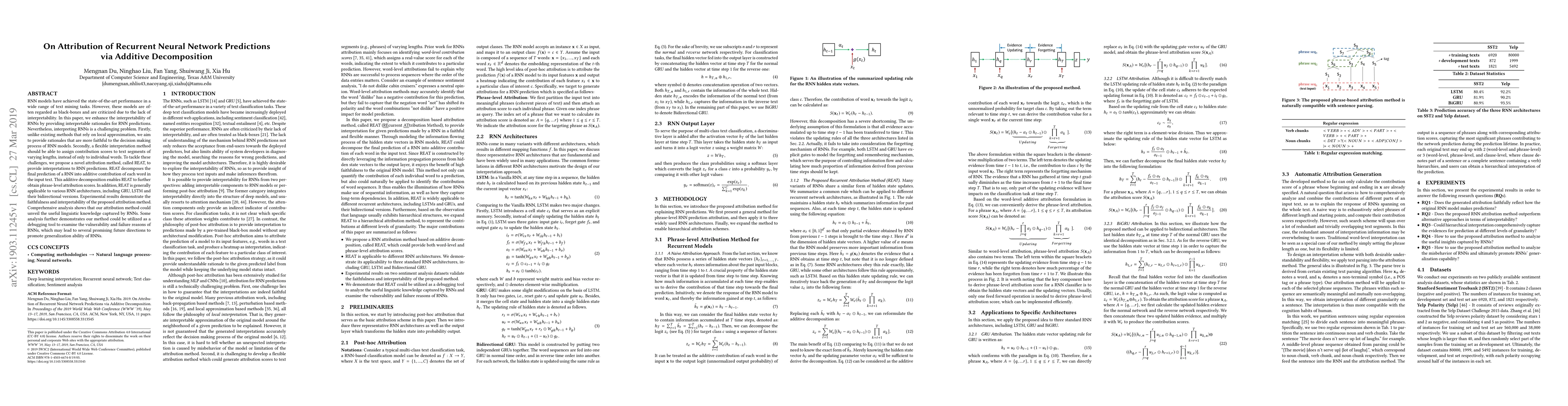 This paper introduces REAT, a novel attribution method to enhance the interpretability of RNN models by providing additive decomposition of their predictions, assigning contribution scores to text segments of varying lengths, and unveiling the linguistic knowledge captured by RNNs. Experimental results show REAT's effectiveness in interpreting RNN decisions and its potential as a debugging tool.