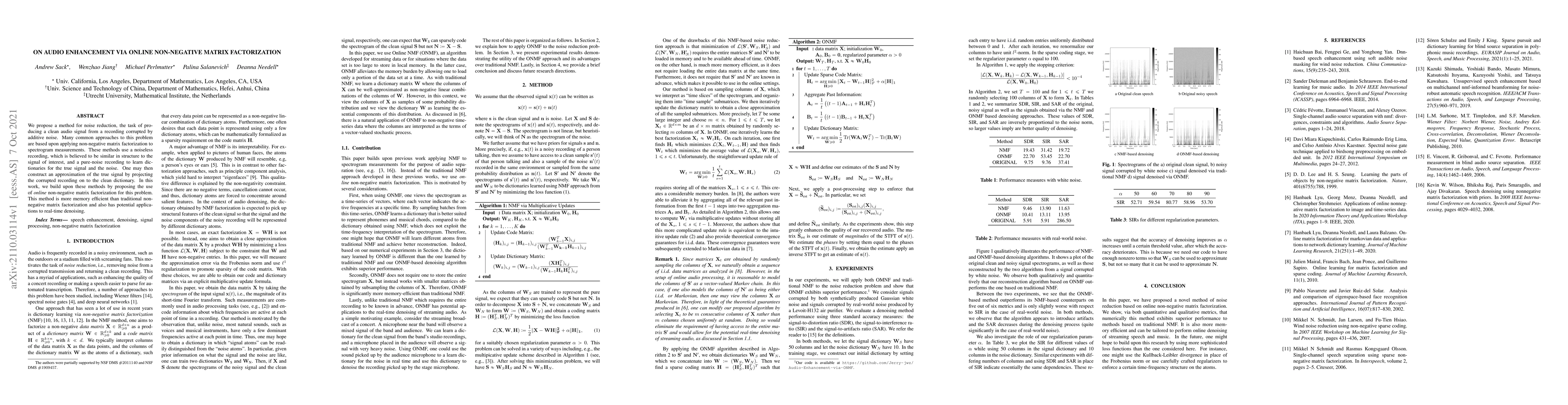 This paper introduces an online non-negative matrix factorization method for noise reduction in audio signals, offering improved memory efficiency over traditional batch methods and potential for real-time denoising applications.