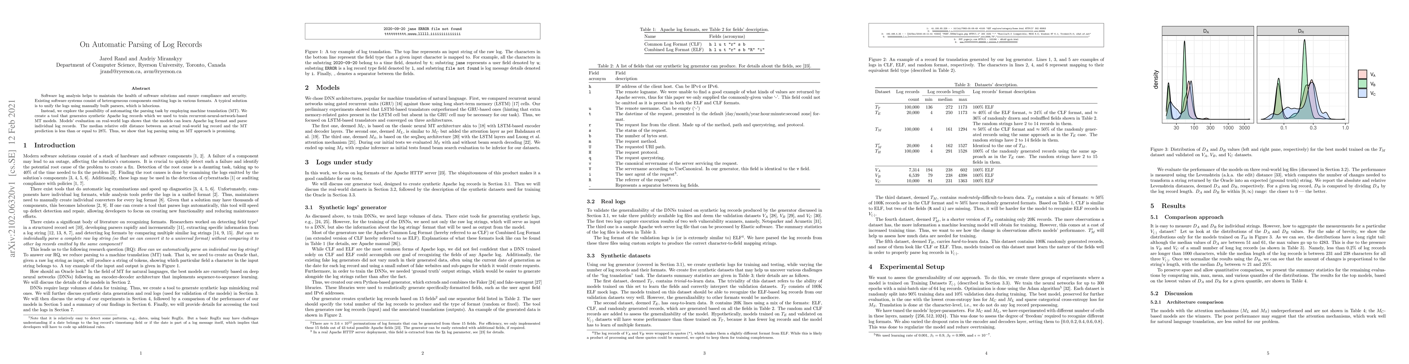 Software log analysis helps to maintain the health of software solutions and ensure compliance and security. Existing software systems consist of heterogeneous components emitting logs in various formats. A typical solution is to unify the logs using manually built parsers, which is laborious. Instead, we explore the possibility of automating the parsing task by employing machine translation (MT). We create a tool that generates synthetic Apache log records which we used to train recurrent-neural-network-based MT models. Models' evaluation on real-world logs shows that the models can learn Apache log format and parse individual log records. The median relative edit distance between an actual real-world log record and the MT prediction is less than or equal to 28%. Thus, we show that log parsing using an MT approach is promising.