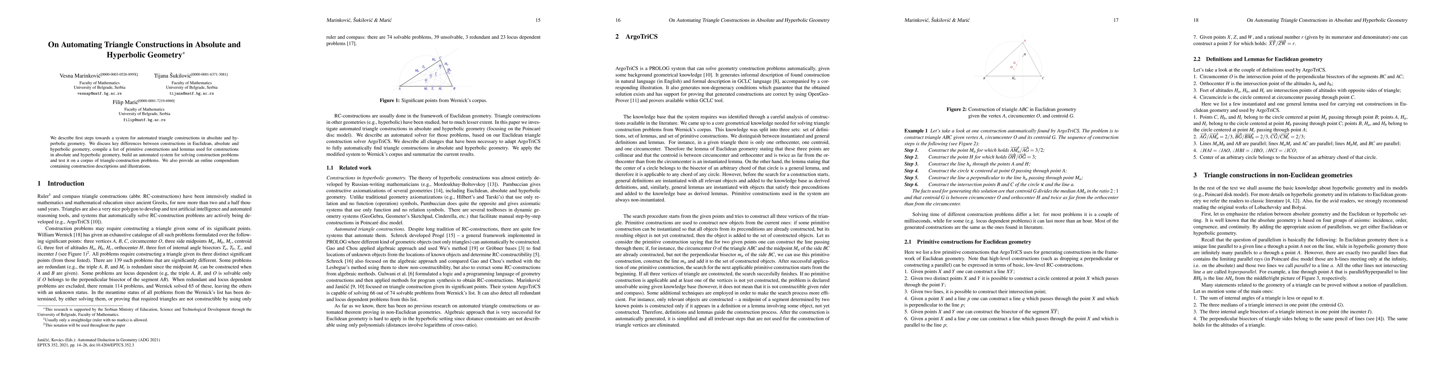 The development of an automated system for triangle constructions in absolute and hyperbolic geometries, along with new primitive constructions and adaptations of existing Euclidean constructions for non-Euclidean settings.