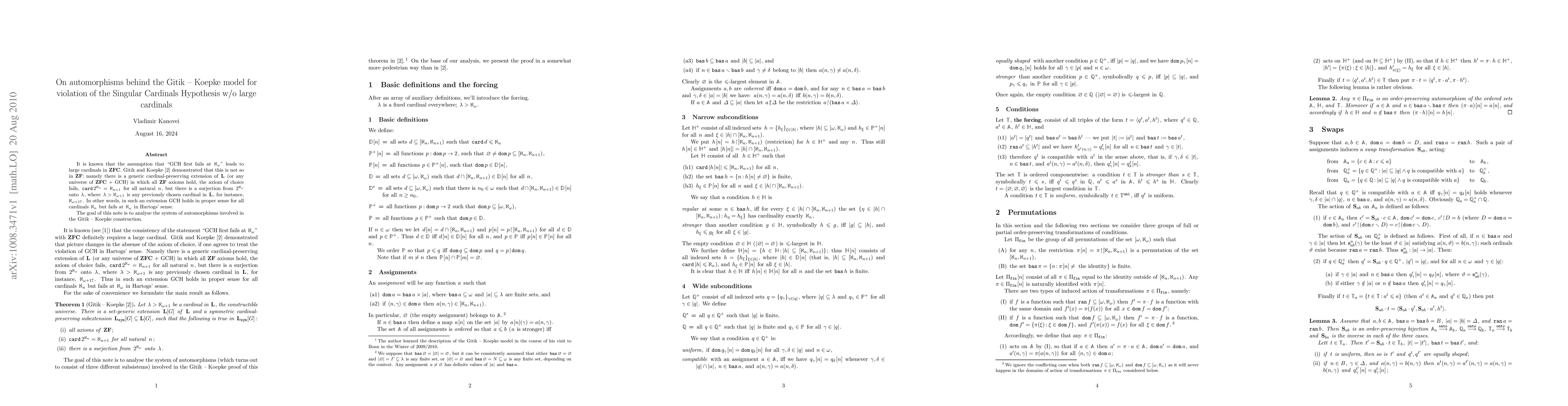 It is known that the assumption that ``GCH first fails at \aleph_{\omega}'' leads to large cardinals in ZFC. Gitik and Koepke have demonstrated that this is not so in ZF: namely there is a generic cardinal-preserving extension of L (or any universe of ZFC + GCH in which all ZF axioms hold, the axiom of choice fails, GCH holds for all cardinals \aleph_n, but there is a surjection from PowerSet(\aleph_{\omega}) onto {\lambda}, where {\lambda} is any previously chosen cardinal in L greater than \aleph_{\omega}, for instance, \aleph_{\omega +17}. In other words, in such an extension GCH holds in proper sense for all cardinals \aleph_n but fails at \aleph_{\omega} in Hartogs' sense. The goal of this note is to analyse the system of automorphisms involved in the Gitik -- Koepke proof.