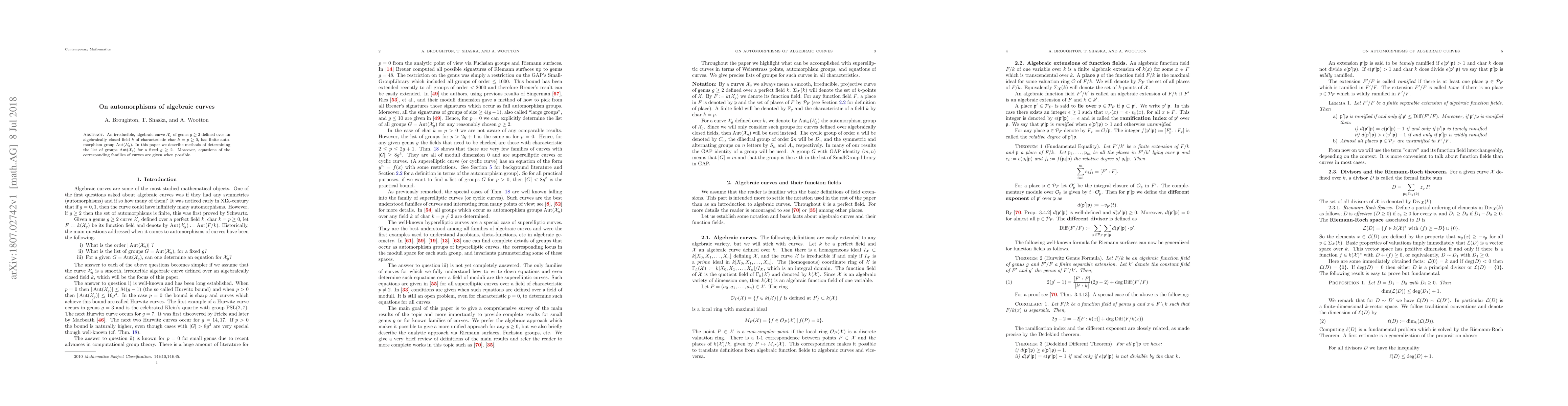 An irreducible, algebraic curve $\mathcal X_g$ of genus $g\geq 2$ defined over an algebraically closed field $k$ of characteristic $\mbox{char } \, k = p \geq 0$, has finite automorphism group $\mbox{Aut} (\mathcal X_g)$. In this paper we describe methods of determining the list of groups $\mbox{Aut} (\mathcal X_g)$ for a fixed $g\geq 2$. Moreover, equations of the corresponding families of curves are given when possible.