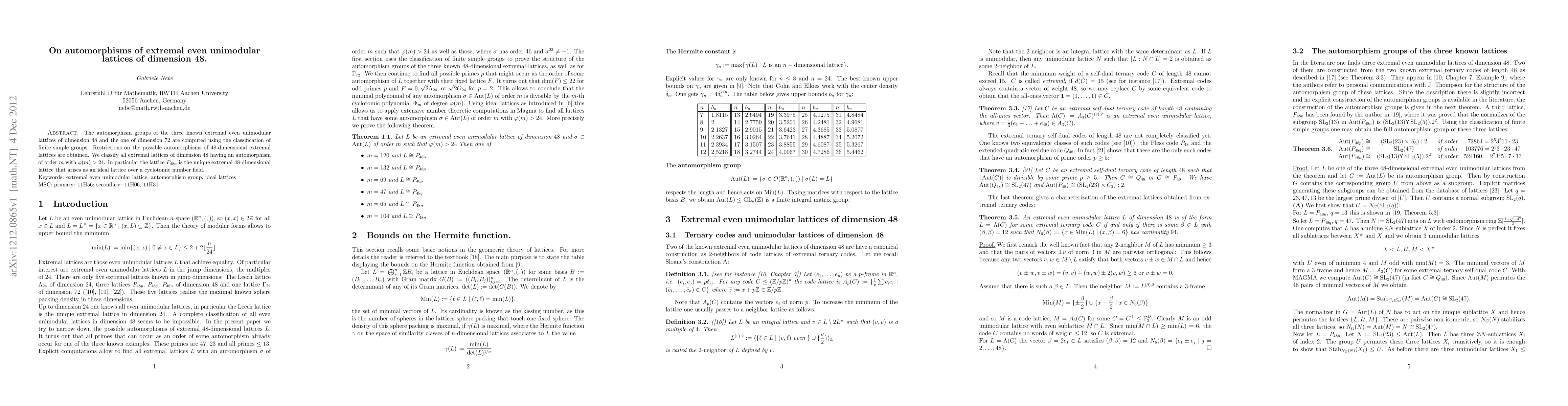 This paper computes the automorphism groups of the three known extremal even unimodular lattices of dimension 48 and dimension 72, using the classification of finite simple groups. It classifies all extremal lattices of dimension 48 with automorphisms of order $m$ where $\varphi(m) > 24$, and identifies $P_{48n}$ as the unique such lattice arising from cyclotomic number fields.