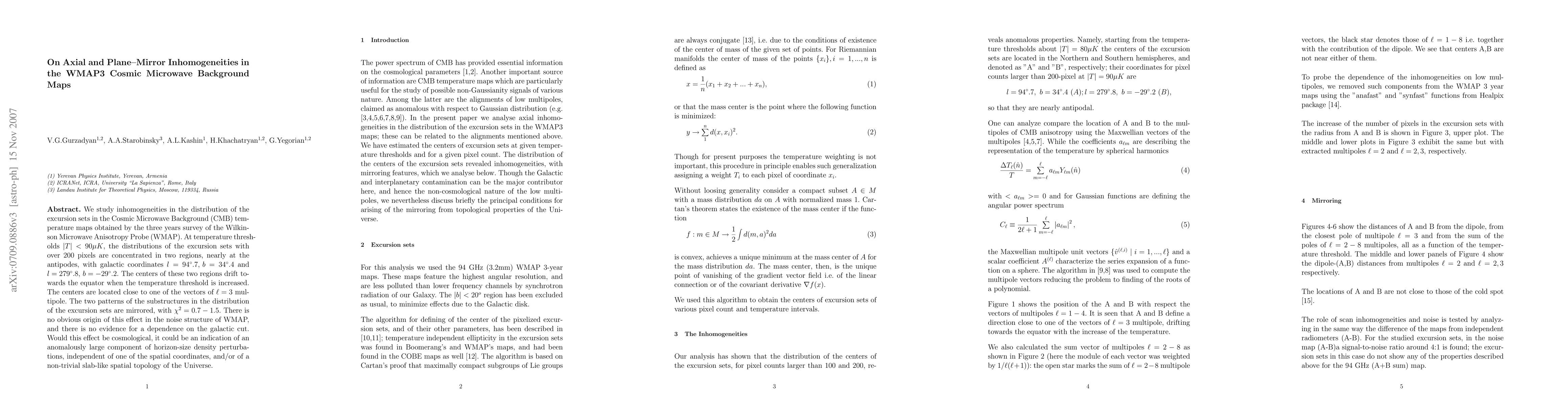 We study inhomogeneities in the distribution of the excursion sets in the Cosmic Microwave Background (CMB) temperature maps obtained by the three years survey of the Wilkinson Microwave Anisotropy Probe (WMAP). At temperature thresholds |T|<90 \mu K, the distributions of the excursion sets with over 200 pixels are concentrated in two regions, nearly at the antipodes, with galactic coordinates l= 94^\circ.7, b= 34^\circ.4 and l= 279^\circ.8, b= -29^\circ.2. The centers of these two regions drift towards the equator when the temperature threshold is increased. The centers are located close to one of the vectors of \ell =3 multipole. The two patterns of the substructures in the distribution of the excursion sets are mirrored, with \chi^2=0.7-1.5. There is no obvious origin of this effect in the noise structure of WMAP, and there is no evidence for a dependence on the galactic cut. Would this effect be cosmological, it could be an indication of an anomalously large component of horizon-size density perturbations, independent of one of the spatial coordinates, and/or of a non-trivial slab-like spatial topology of the Universe.