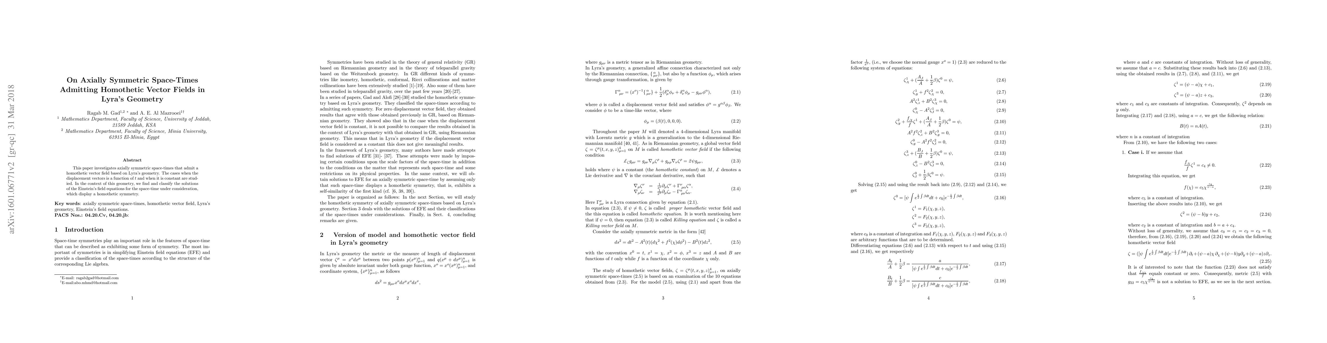 This paper explores axially symmetric space-times in Lyra's geometry that allow for homothetic vector fields, classifying solutions of Einstein's field equations when the displacement vector is either time-dependent or constant.