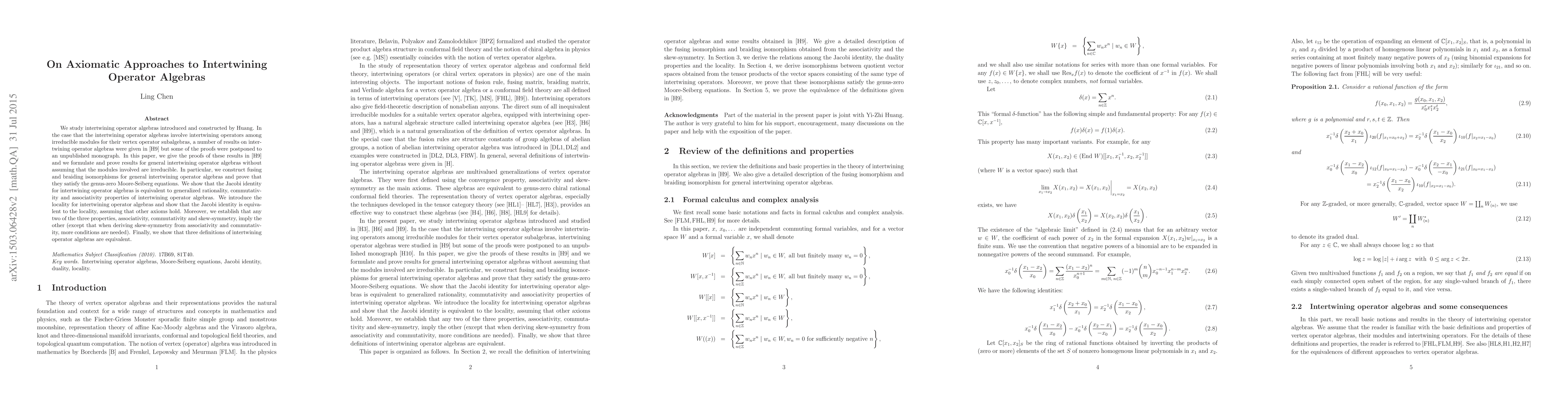 We study intertwining operator algebras introduced and constructed by Huang. In the case that the intertwining operator algebras involve intertwining operators among irreducible modules for their vertex operator subalgebras, a number of results on intertwining operator algebras were given in [H9] but some of the proofs were postponed to an unpublished monograph. In this paper, we give the proofs of these results in [H9] and we formulate and prove results for general intertwining operator algebras without assuming that the modules involved are irreducible. In particular, we construct fusing and braiding isomorphisms for general intertwining operator algebras and prove that they satisfy the genus-zero Moore-Seiberg equations. We show that the Jacobi identity for intertwining operator algebras is equivalent to generalized rationality, commutativity and associativity properties of intertwining operator algebras. We introduce the locality for intertwining operator algebras and show that the Jacobi identity is equivalent to the locality, assuming that other axioms hold. Moreover, we establish that any two of the three properties, associativity, commutativity and skew-symmetry, imply the other (except that when deriving skew-symmetry from associativity and commutativity, more conditions are needed). Finally, we show that three definitions of intertwining operator algebras are equivalent.