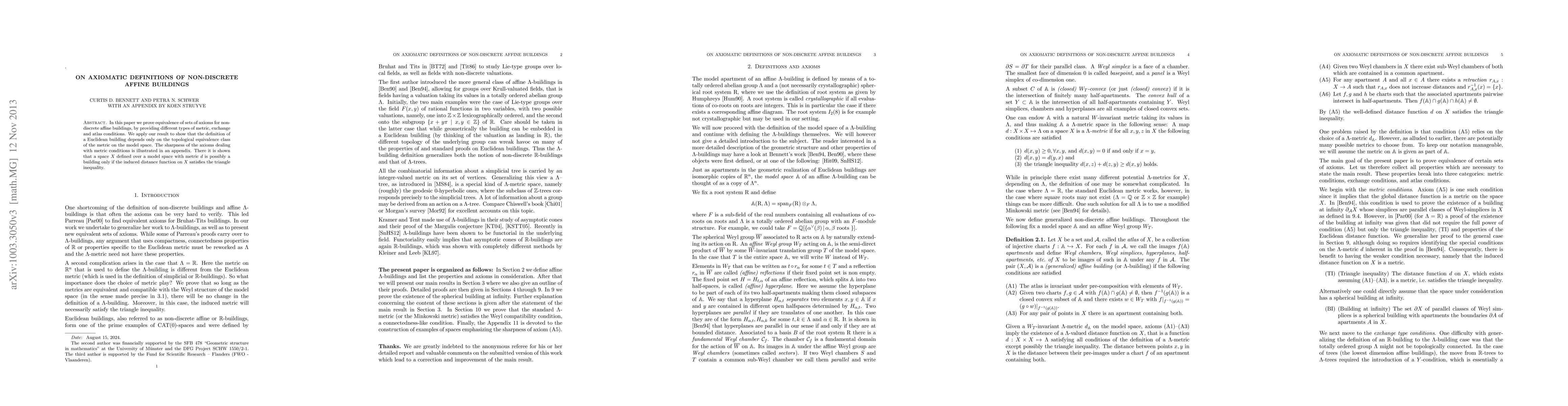This paper establishes the equivalence of various axiom sets for non-discrete affine buildings, demonstrating that the definition of a Euclidean building hinges solely on the topological equivalence of the metric on the model space. An appendix highlights the necessity of the triangle inequality for a space to qualify as a building.