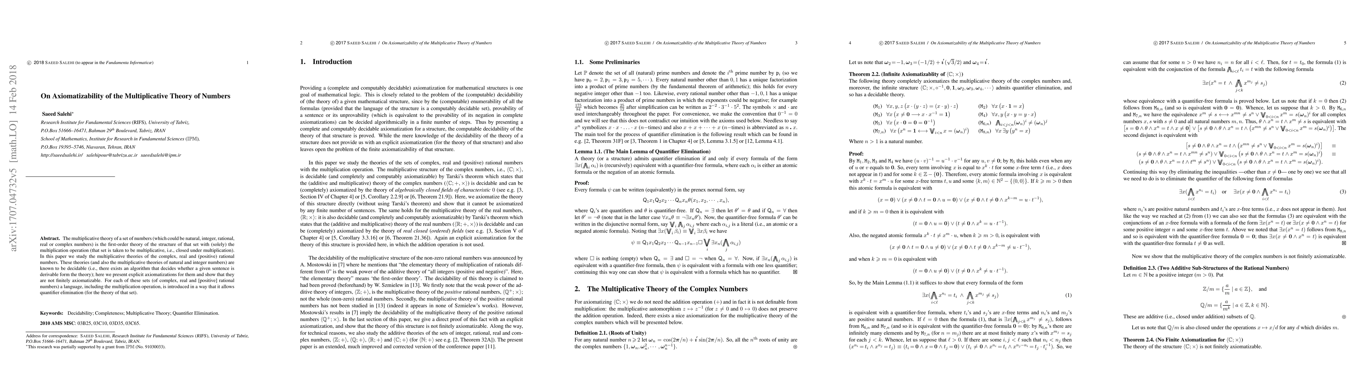 Researchers found explicit axiomatizations for the multiplicative theories of complex, real, and rational numbers, showing they are not finitely axiomatizable. This implies that these mathematical structures can be formally described using a set of rules.