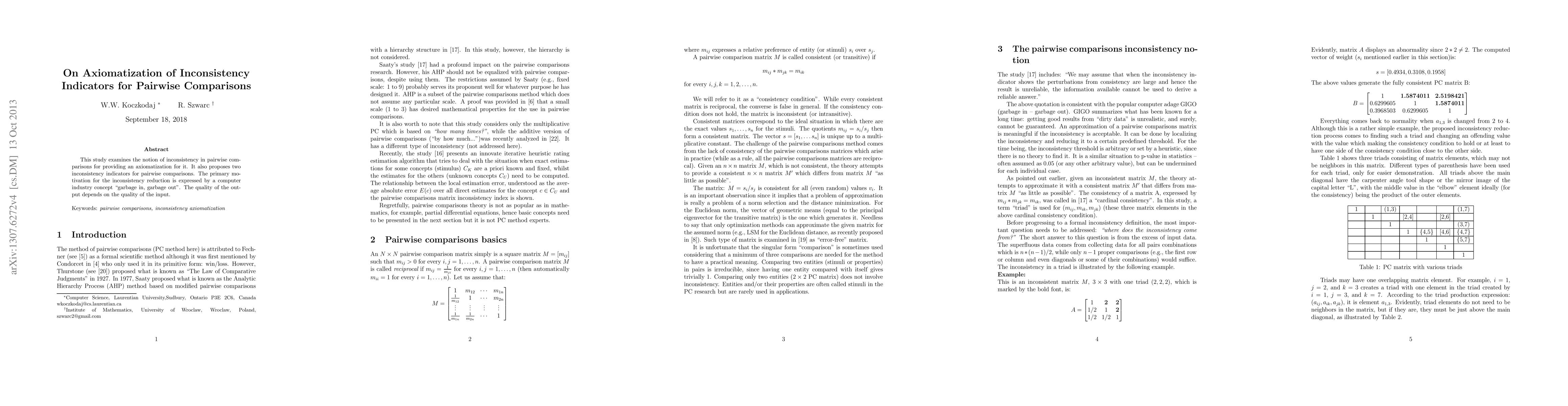 Summary: This paper proposes an axiomatization for inconsistency in pairwise comparisons that is method-independent, demonstrating that the eigenvalue-based inconsistency measure used in Analytic Hierarchy Process (AHP) is flawed. The focus is on establishing a universal framework for evaluating inconsistency.