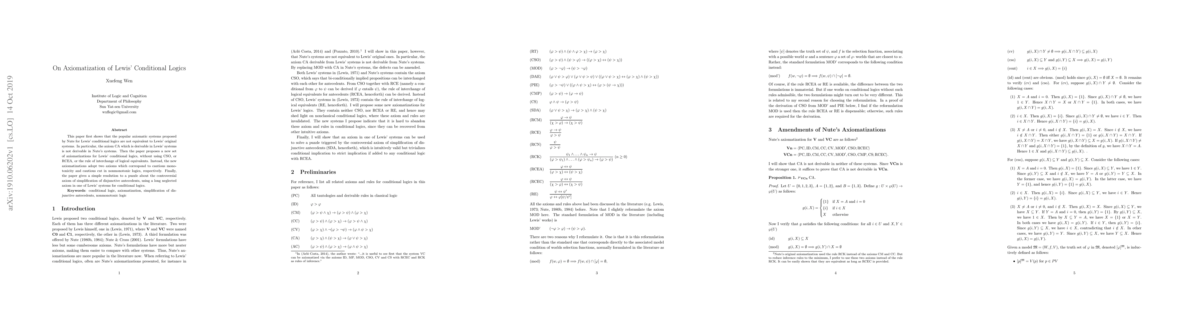 This paper demonstrates that Nute's axiomatizations for Lewis' conditional logics differ from Lewis' original systems, particularly regarding the axiom CA. It proposes new axiomatizations based on cautious monotonicity and cautious cut, avoiding CSO, RCEA, and the rule of interchange, and resolves a puzzle about the axiom of simplification of disjunctive antecedents.