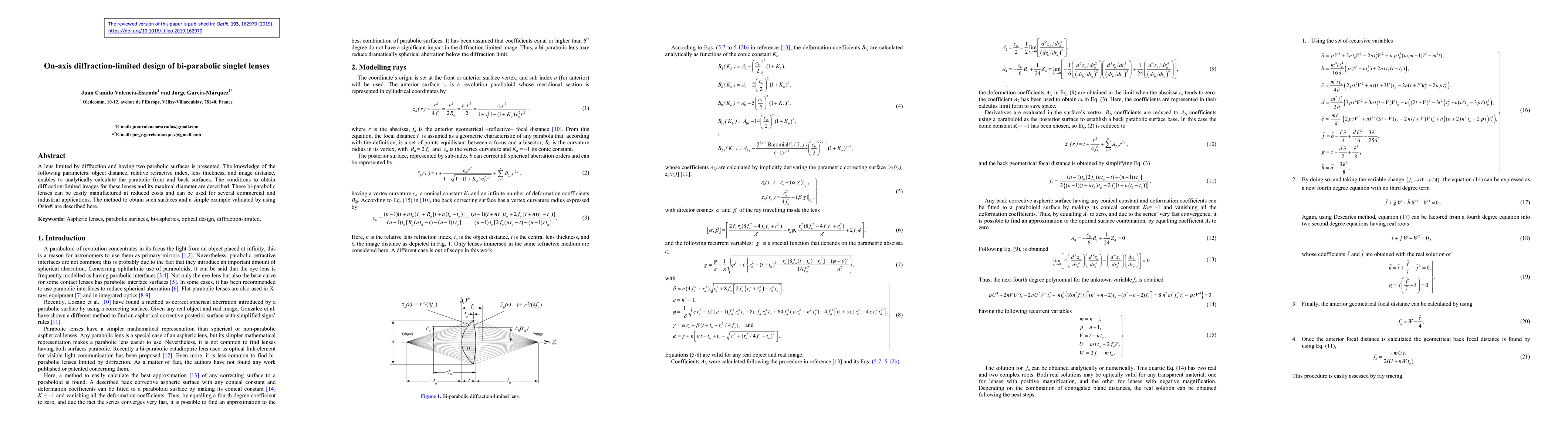 This paper introduces a design for bi-parabolic singlet lenses, limited by diffraction, with analytical calculations for parabolic front and back surfaces using object distance, relative refractive index, lens thickness, and image distance. The method allows for cost-effective manufacturing and has applications in commercial and industrial sectors.