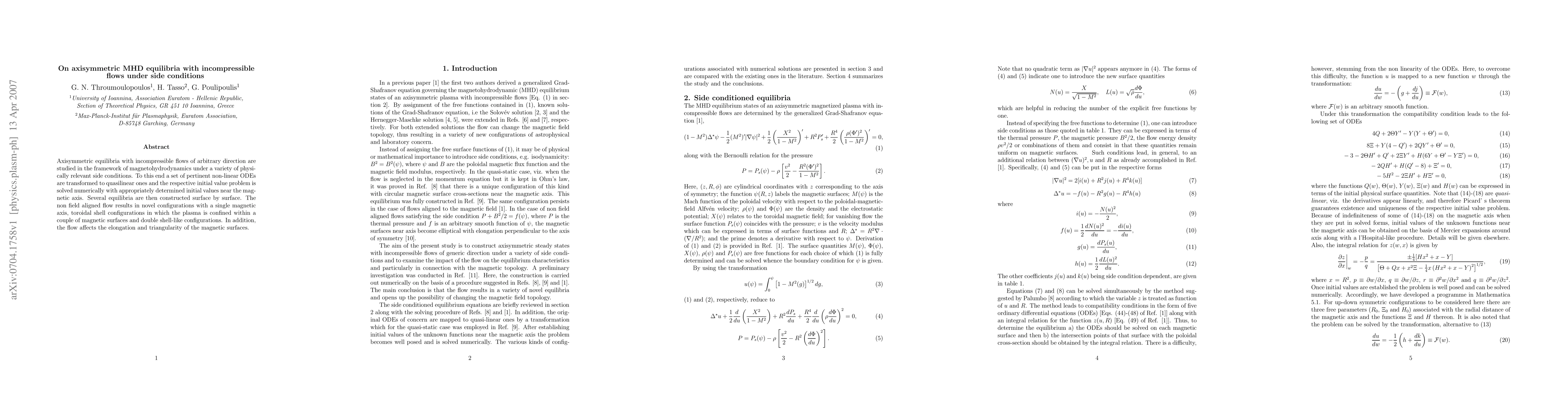 This paper investigates axisymmetric magnetohydrodynamic equilibria with incompressible flows under various side conditions, transforming non-linear ODEs into quasilinear forms and solving them numerically. The study reveals novel configurations including single magnetic axis, toroidal shell, and double shell-like structures, influenced by non-field aligned flow.