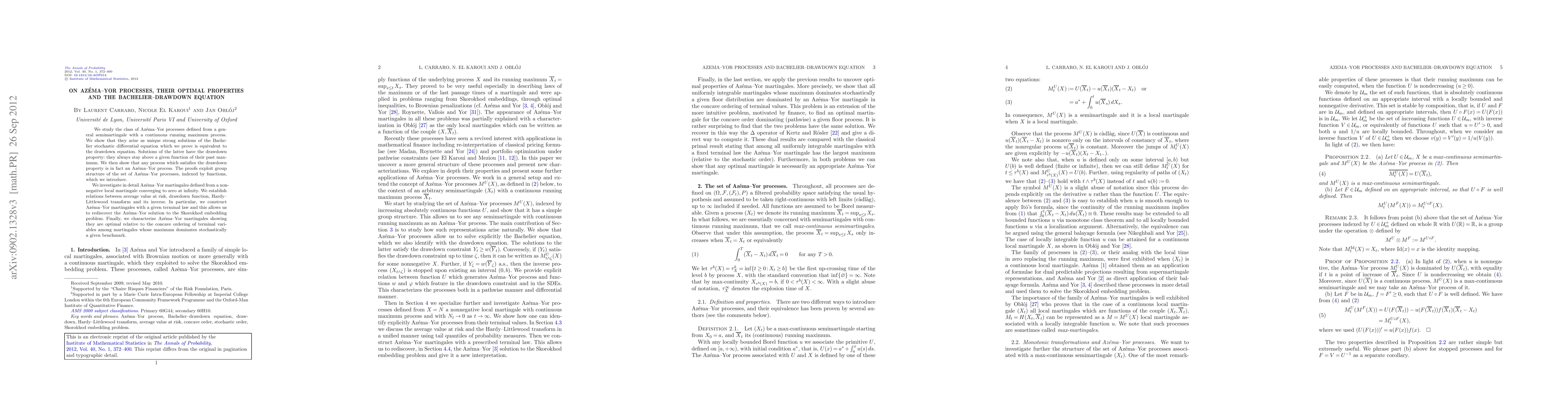 The paper investigates Az\'ema-Yor processes, proving they solve the Bachelier stochastic differential equation and exhibit the drawdown property. It establishes optimal properties of these processes, linking them to the Skorokhod embedding problem and characterizing them as optimal relative to the concave ordering.