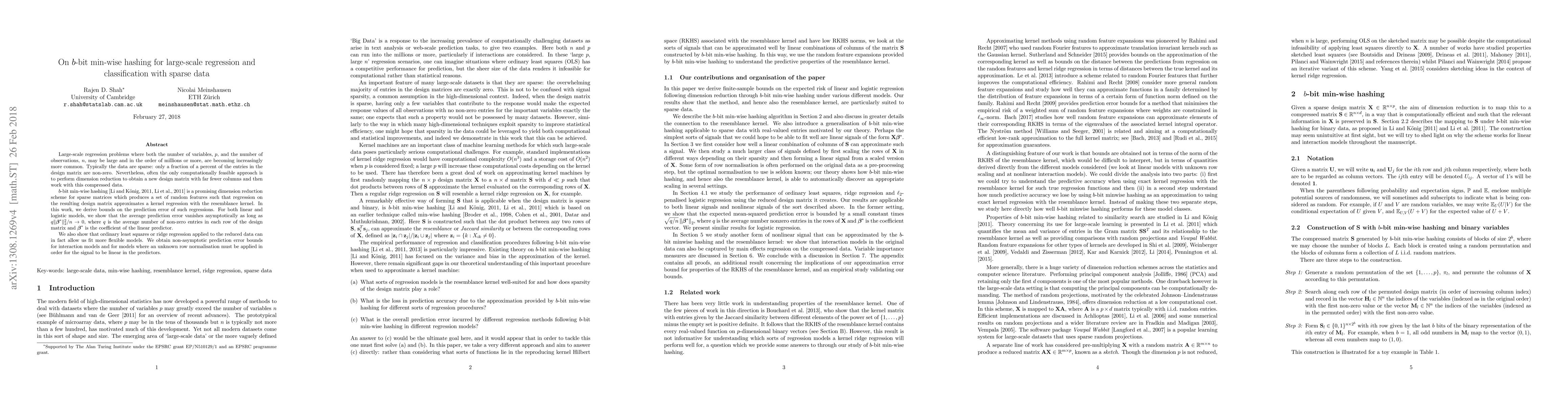 Large-scale regression problems where both the number of variables, $p$, and the number of observations, $n$, may be large and in the order of millions or more, are becoming increasingly more common. Typically the data are sparse: only a fraction of a percent of the entries in the design matrix are non-zero. Nevertheless, often the only computationally feasible approach is to perform dimension reduction to obtain a new design matrix with far fewer columns and then work with this compressed data. $b$-bit min-wise hashing (Li and Konig, 2011) is a promising dimension reduction scheme for sparse matrices which produces a set of random features such that regression on the resulting design matrix approximates a kernel regression with the resemblance kernel. In this work, we derive bounds on the prediction error of such regressions. For both linear and logistic models we show that the average prediction error vanishes asymptotically as long as $q \|\beta^*\|_2^2 /n \rightarrow 0$, where $q$ is the average number of non-zero entries in each row of the design matrix and $\beta^*$ is the coefficient of the linear predictor. We also show that ordinary least squares or ridge regression applied to the reduced data can in fact allow us fit more flexible models. We obtain non-asymptotic prediction error bounds for interaction models and for models where an unknown row normalisation must be applied in order for the signal to be linear in the predictors.