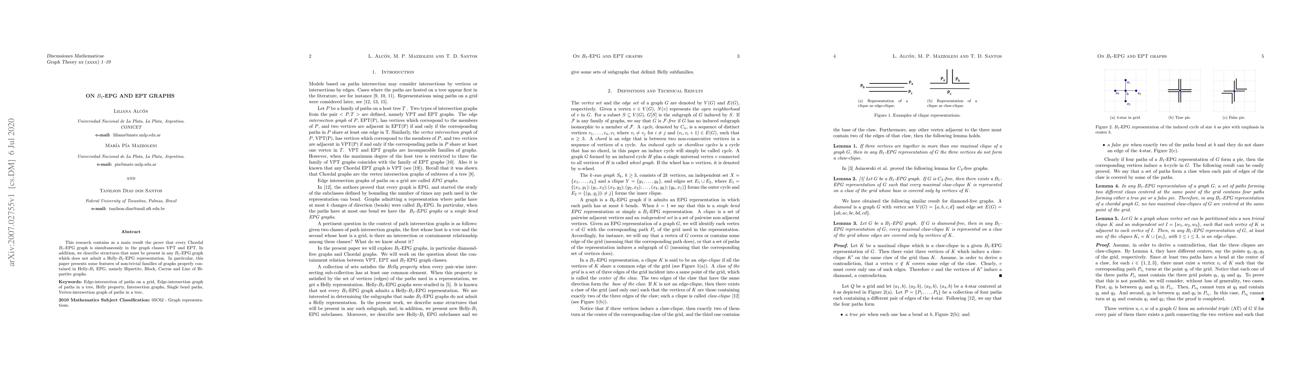 This research contains as a main result the prove that every Chordal $B_1$-EPG graph is simultaneously in the graph classes VPT and EPT. In addition, we describe structures that must be present in any $B_1$-EPG graph which does not admit a Helly-$B_1$-EPG representation. In particular, this paper presents some features of non-trivial families of graphs properly contained in Helly-$B_1$ EPG, namely Bipartite, Block, Cactus and Line of Bipartite graphs.
