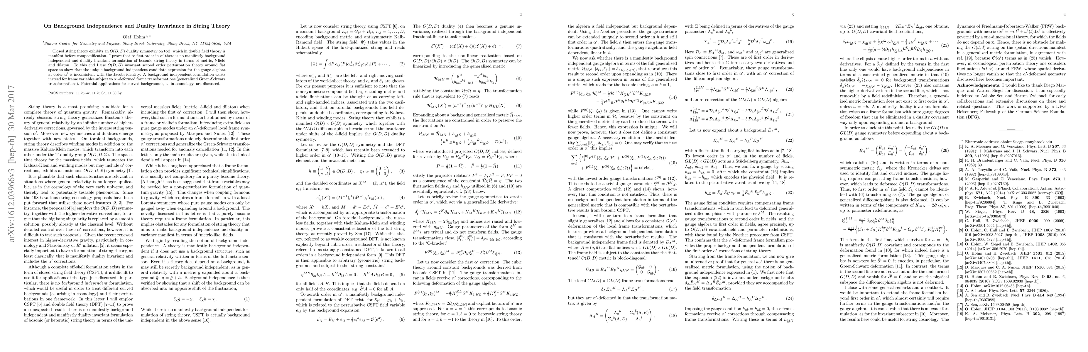 This paper proves that there is no manifestly background independent and duality invariant formulation of bosonic string theory using metric, b-field, and dilaton to first order in $\alpha'$. Instead, a background independent formulation exists for frame variables under $\alpha'$-deformed frame transformations, with potential applications for curved backgrounds.