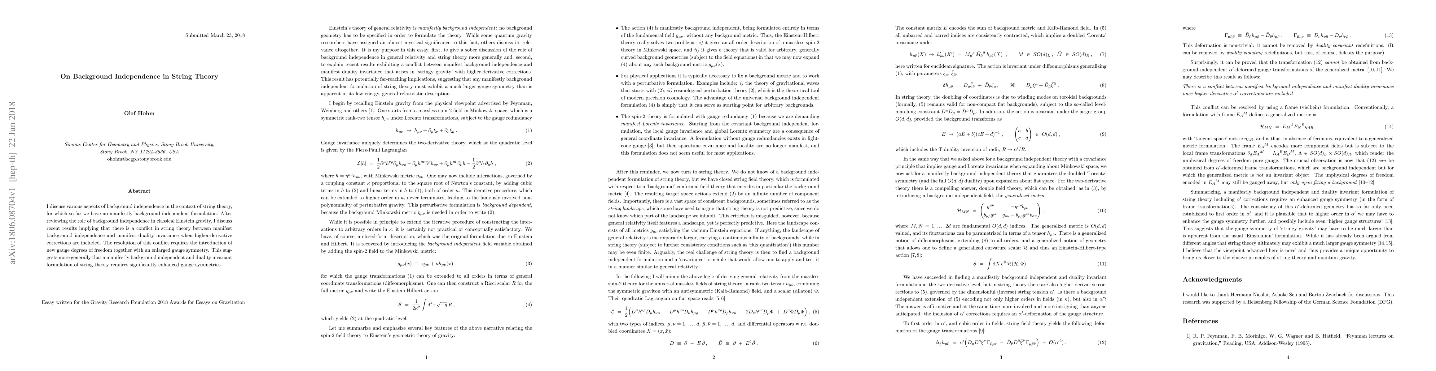 This paper explores the challenge of achieving background independence in string theory, highlighting a conflict between this requirement and duality invariance when higher-derivative corrections are considered. The resolution necessitates the incorporation of new gauge degrees of freedom and an enlarged gauge symmetry, indicating that a fully background independent and duality invariant string theory formulation may need substantially enhanced gauge symmetries.