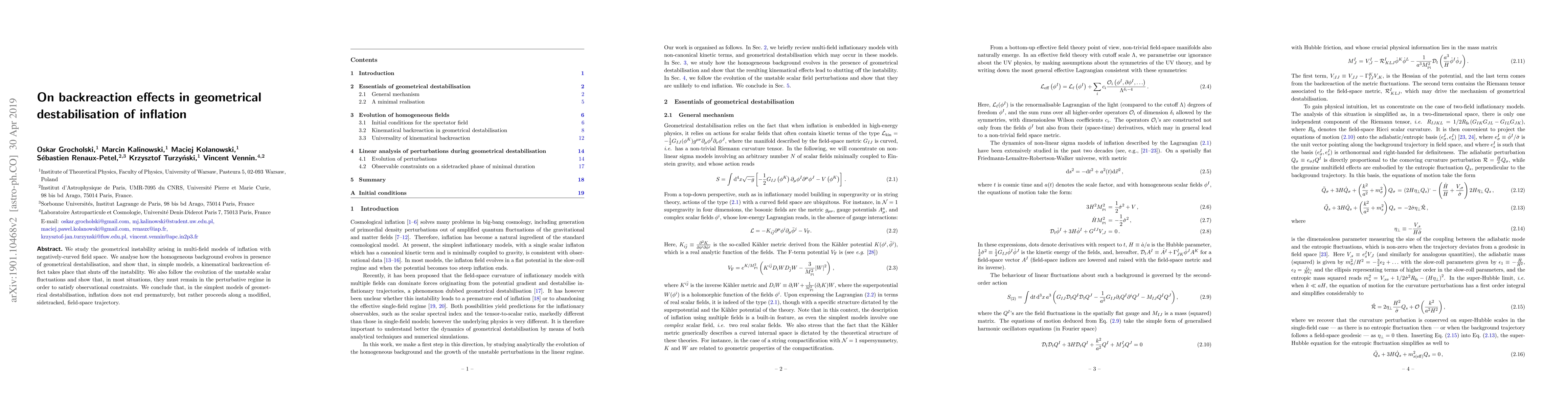 We study the geometrical instability arising in multi-field models of inflation with negatively-curved field space. We analyse how the homogeneous background evolves in presence of geometrical destabilisation, and show that, in simple models, a kinematical backreaction effect takes place that shuts off the instability. We also follow the evolution of the unstable scalar fluctuations. We show that they assist the kinematical backreaction while remaining in the perturbative regime. We conclude that, in the simplest models of geometrical destabilisation, inflation does not end prematurely, but rather proceeds along a modified, sidetracked, field-space trajectory.