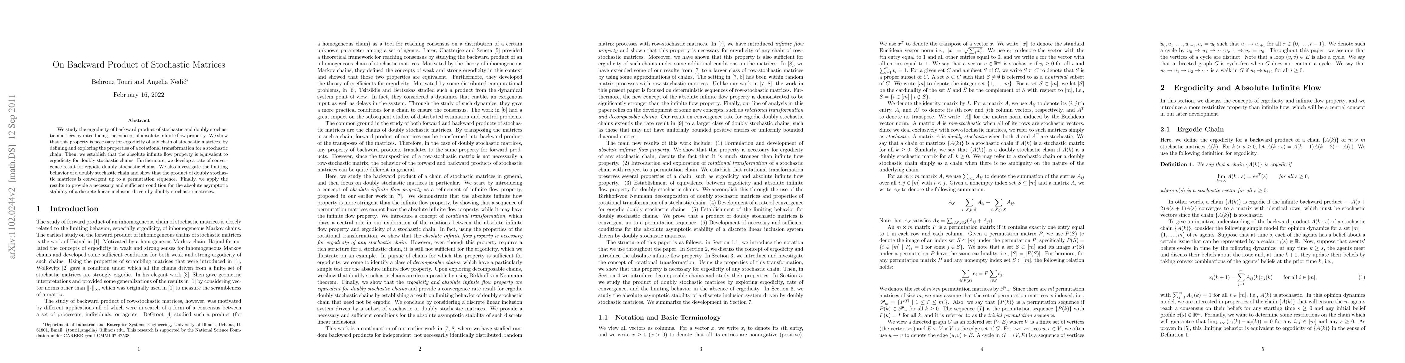 This paper explores the ergodicity of backward product of stochastic matrices through the introduction of the absolute infinite flow property, establishing its necessity for stochastic chains. It also proves the equivalence of this property to ergodicity for doubly stochastic chains and provides a rate of convergence result, concluding with applications to the stability of discrete linear inclusions.