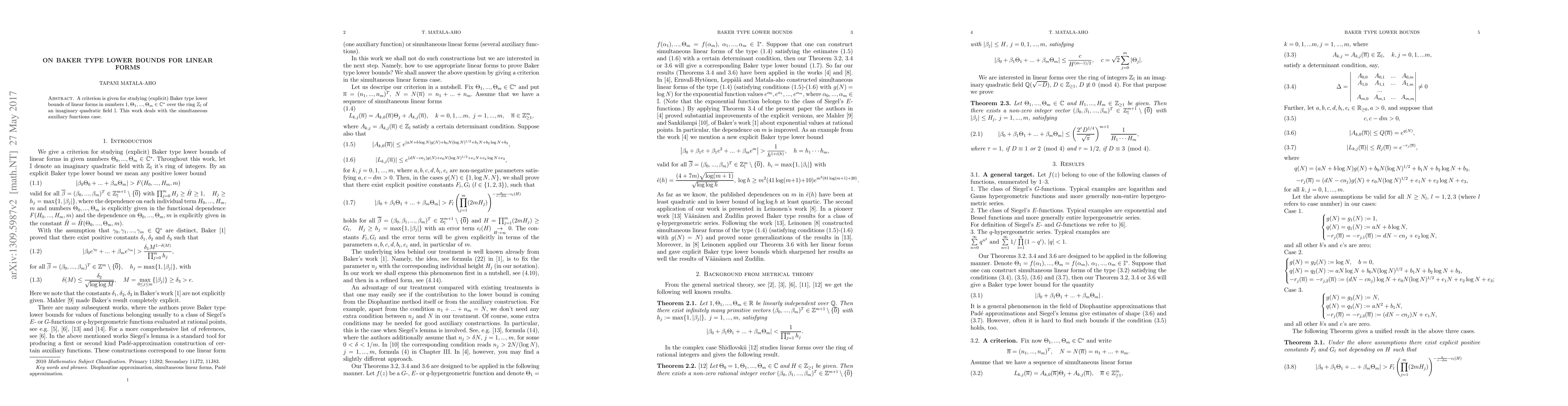 A criterion is given for studying (explicit) Baker type lower bounds of linear forms in numbers $1,\Theta_1,...,\Theta_m\in\mathbb{C}^*$ over the ring $\mathbb{Z}_{\mathbb{I}}$ of an imaginary quadratic field $\mathbb{I}$. This work deals with the simultaneous auxiliary functions case.