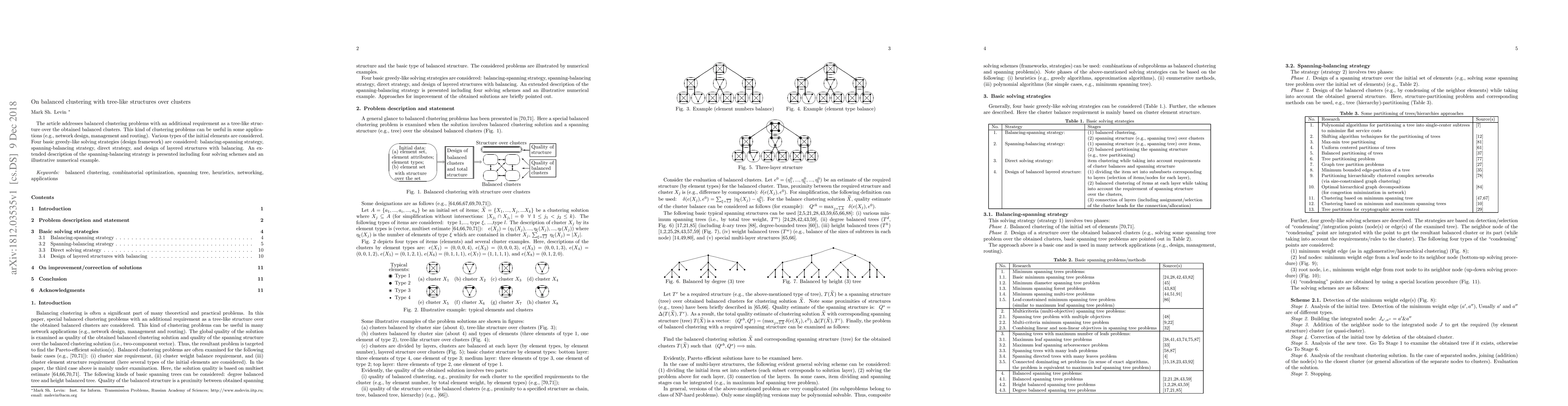 The article addresses balanced clustering problems with an additional requirement as a tree-like structure over the obtained balanced clusters. This kind of clustering problems can be useful in some applications (e.g., network design, management and routing). Various types of the initial elements are considered. Four basic greedy-like solving strategies (design framework) are considered: balancing-spanning strategy, spanning-balancing strategy, direct strategy, and design of layered structures with balancing. An extended description of the spanning-balancing strategy is presented including four solving schemes and an illustrative numerical example.