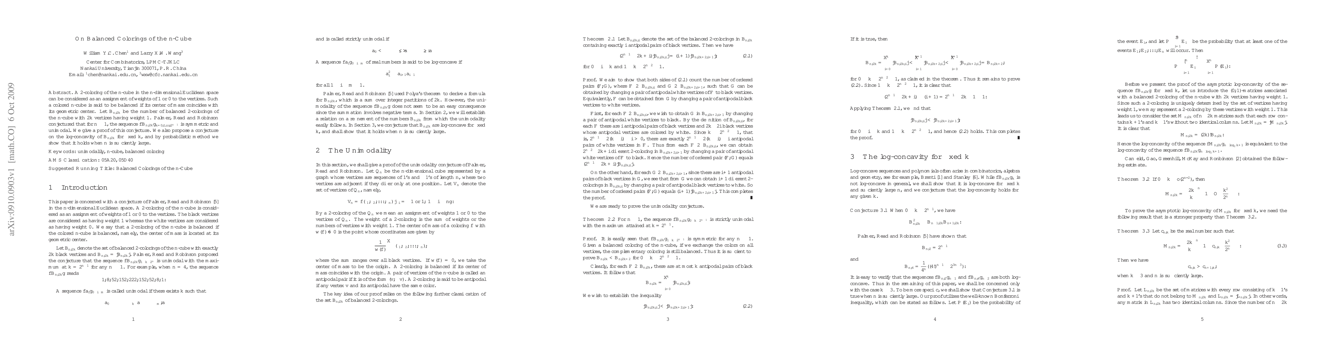 This paper proves the conjecture by Palmer, Read, and Robinson that the sequence of balanced 2-colorings of the n-cube is symmetric and unimodal. It also proposes a new conjecture on the log-concavity of these balanced colorings and demonstrates its validity for large n using probabilistic methods.