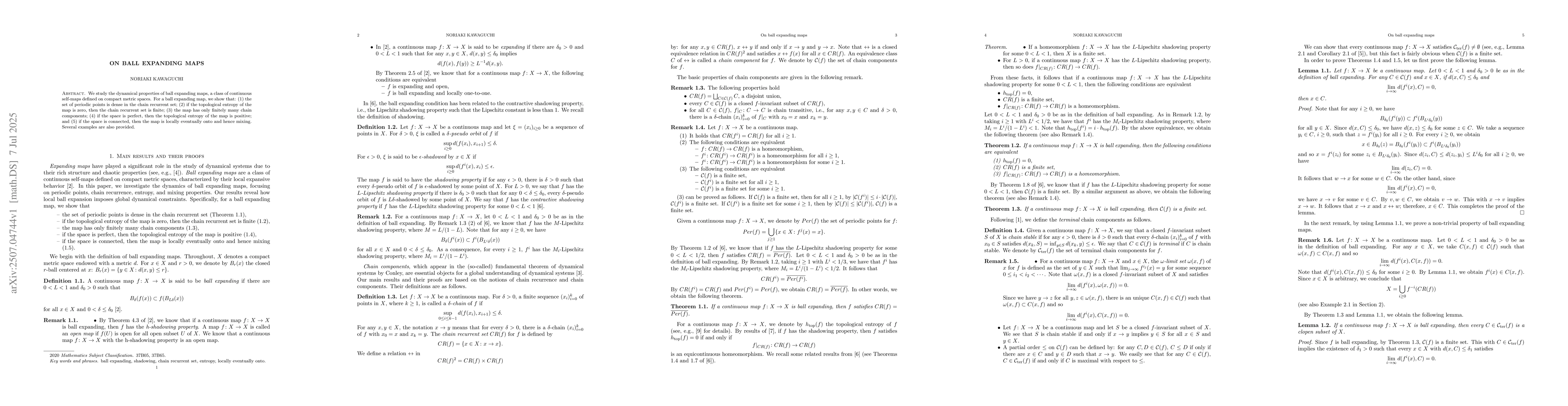 We study the dynamical properties of ball expanding maps, a class of continuous self-maps defined on compact metric spaces. For a ball expanding map, we show that: (1) the set of periodic points is dense in the chain recurrent set; (2) if the topological entropy of the map is zero, then the chain recurrent set is finite; (3) the map has only finitely many chain components; (4) if the space is perfect, then the topological entropy of the map is positive; and (5) if the space is connected, then the map is locally eventually onto and hence mixing. Several examples are also provided.