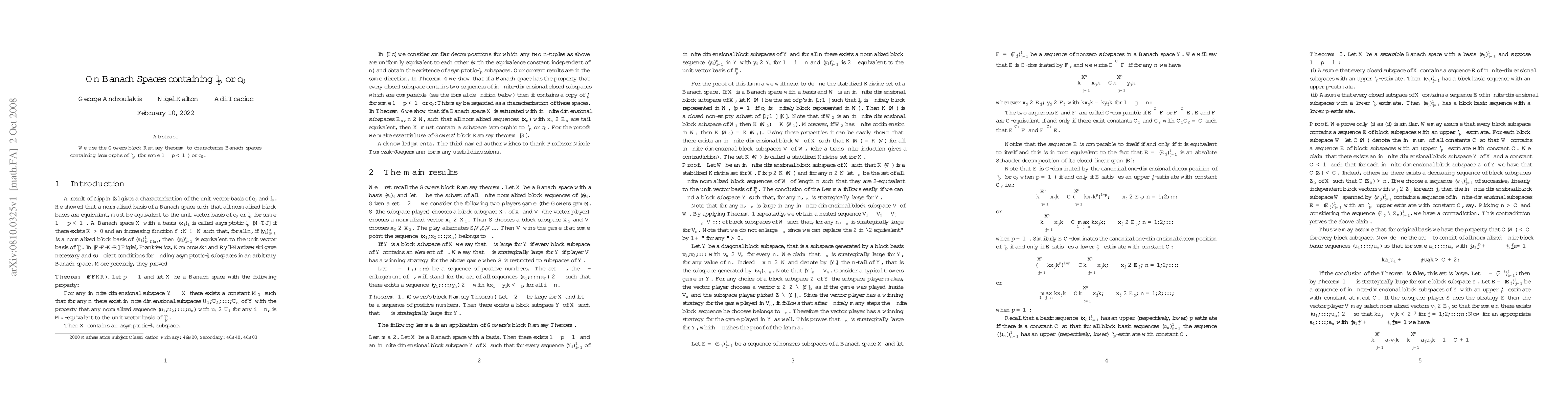 Summary: This paper utilizes the Gowers block Ramsey theorem to identify Banach spaces that contain isomorphic copies of either the $\ell_p$ spaces for $1 \leq p < \infty$ or the $c_0$ space. The study provides a characterization of such spaces based on their structural properties.