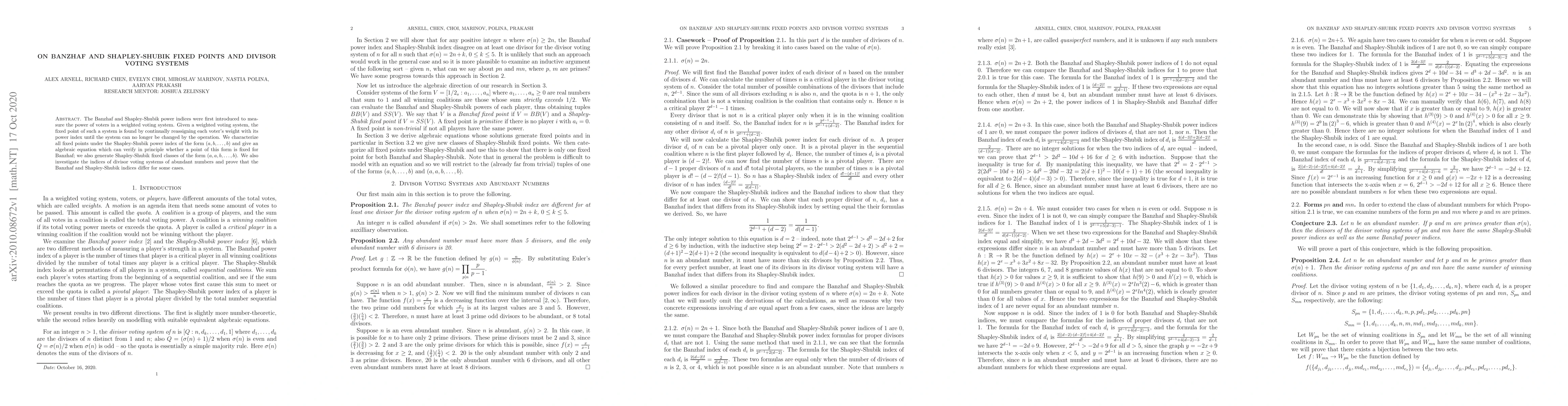The Banzhaf and Shapley-Shubik power indices were first introduced to measure the power of voters in a weighted voting system. Given a weighted voting system, the fixed point of such a system is found by continually reassigning each voter's weight with its power index until the system can no longer be changed by the operation. We characterize all fixed points under the Shapley-Shubik power index of the form $(a,b,\ldots,b)$ and give an algebraic equation which can verify in principle whether a point of this form is fixed for Banzhaf; we also generate Shapley-Shubik fixed classes of the form $(a,a,b,\ldots,b)$. We also investigate the indices of divisor voting systems of abundant numbers and prove that the Banzhaf and Shapley-Shubik indices differ for some cases.