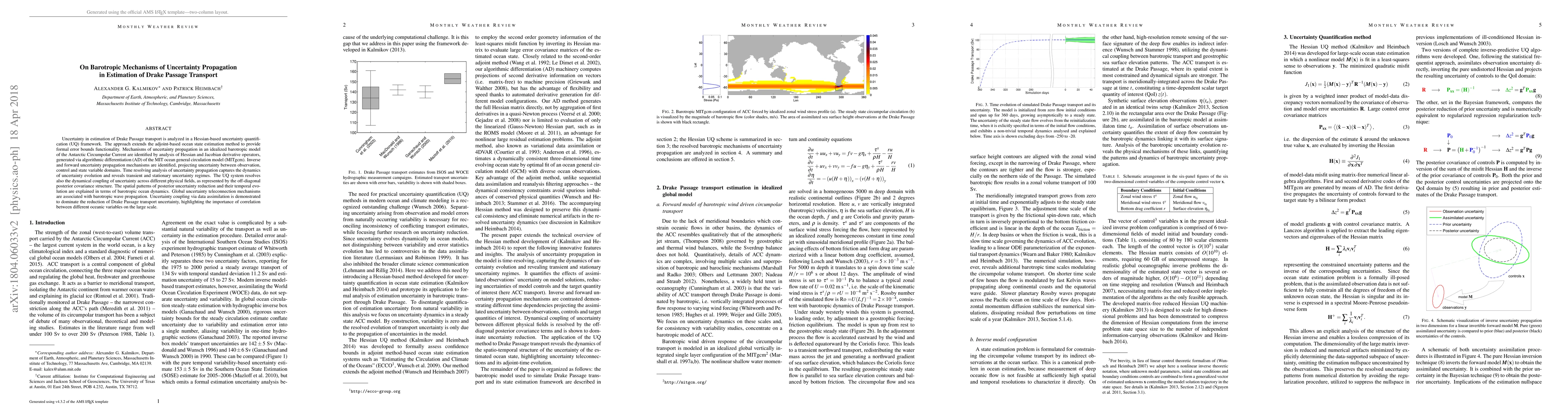 This paper analyzes uncertainty propagation in estimating Drake Passage transport using a Hessian-based uncertainty quantification framework. It identifies mechanisms of uncertainty propagation in a barotropic model, revealing the dynamics of uncertainty evolution and the coupling between different oceanic variables via data assimilation.