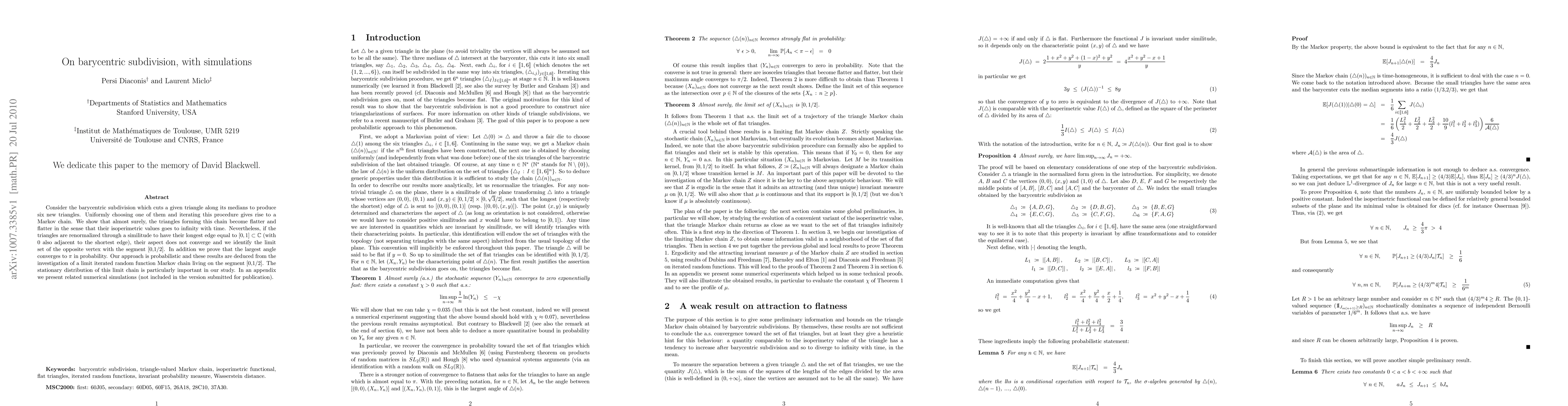 Consider the barycentric subdivision which cuts a given triangle along its medians to produce six new triangles. Uniformly choosing one of them and iterating this procedure gives rise to a Markov chain. We show that almost surely, the triangles forming this chain become flatter and flatter in the sense that their isoperimetric values goes to infinity with time. Nevertheless, if the triangles are renormalized through a similitude to have their longest edge equal to $[0,1]\subset\CC$ (with 0 also adjacent to the shortest edge), their aspect does not converge and we identify the limit set of the opposite vertex with the segment [0,1/2]. In addition we prove that the largest angle converges to $\pi$ in probability. Our approach is probabilistic and these results are deduced from the investigation of a limit iterated random function Markov chain living on the segment [0,1/2]. The stationary distribution of this limit chain is particularly important in our study. In an appendix we present related numerical simulations (not included in the version submitted for publication).