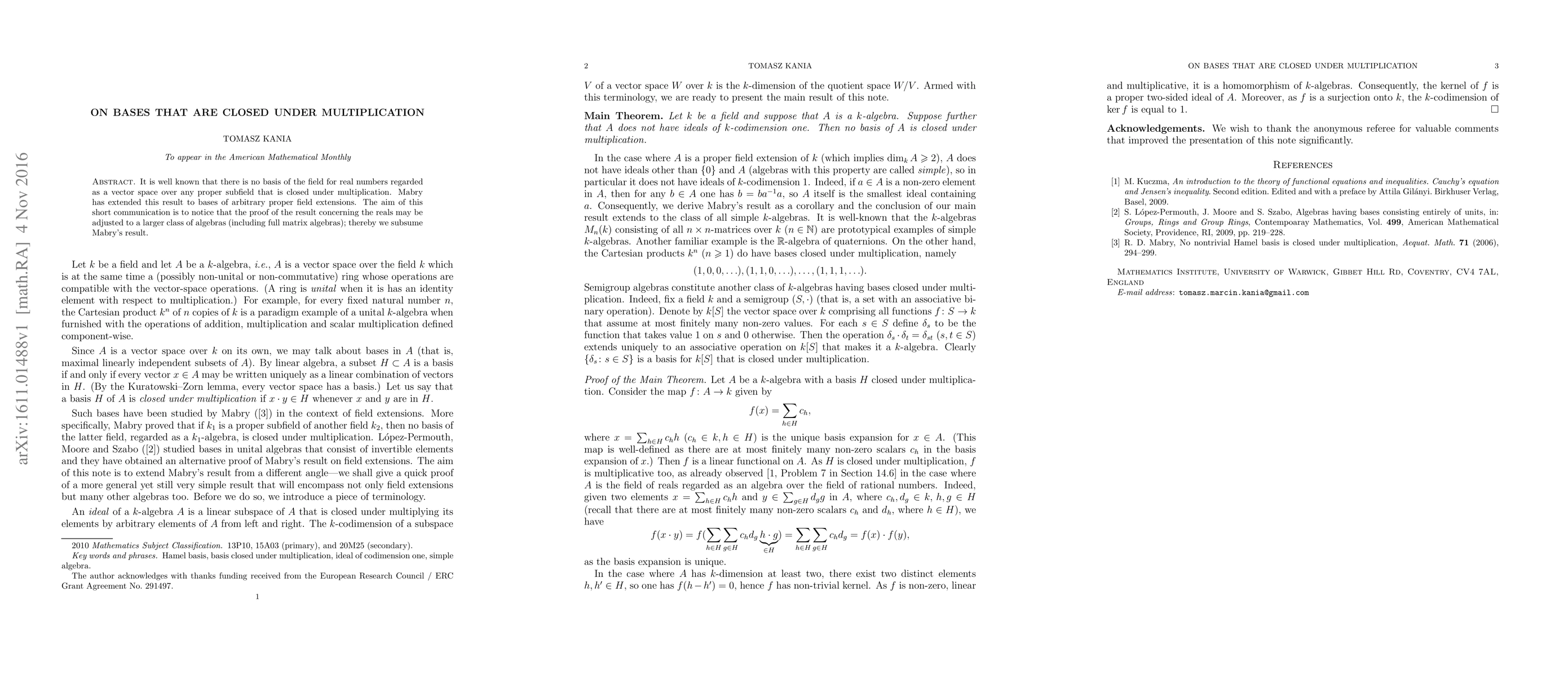 It is well known that there is no basis of the field for real numbers regarded as a vector space over any proper subfield that is closed under multiplication. Mabry has extended this result to bases of arbitrary proper field extensions. The aim of this short communication is to notice that the proof of the result concerning the reals may be adjusted to a larger class of algebras (including full matrix algebras); thereby we subsume Mabry's result.