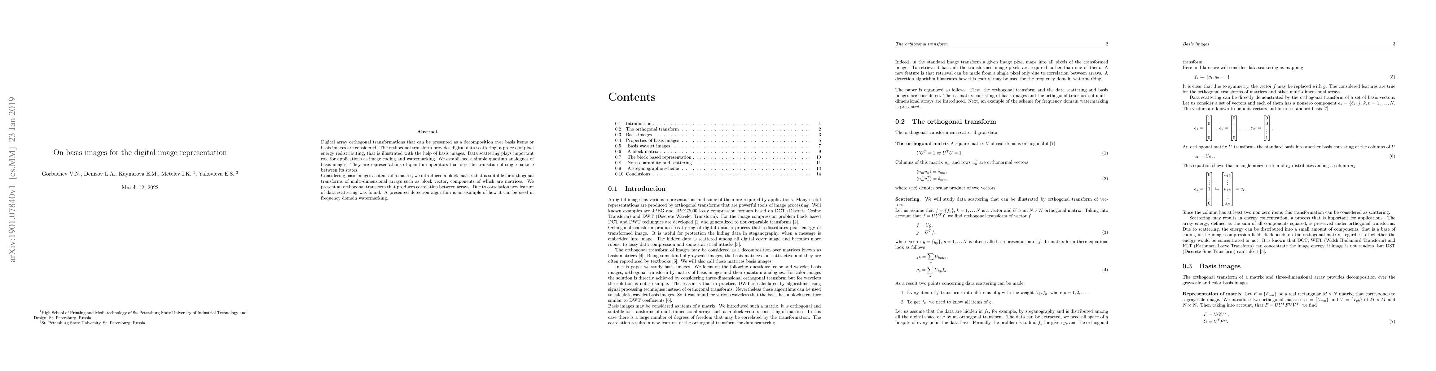 Digital array orthogonal transformations that can be presented as a decomposition over basis items or basis images are considered. The orthogonal transform provides digital data scattering, a process of pixel energy redistributing, that is illustrated with the help of basis images. Data scattering plays important role for applications as image coding and watermarking. We established a simple quantum analogues of basis images. They are representations of quantum operators that describe transition of single particle between its states. Considering basis images as items of a matrix, we introduced a block matrix that is suitable for orthogonal transforms of multi-dimensional arrays such as block vector, components of which are matrices. We present an orthogonal transform that produces correlation between arrays. Due to correlation new feature of data scattering was found. A presented detection algorithm is an example of how it can be used in frequency domain watermarking.