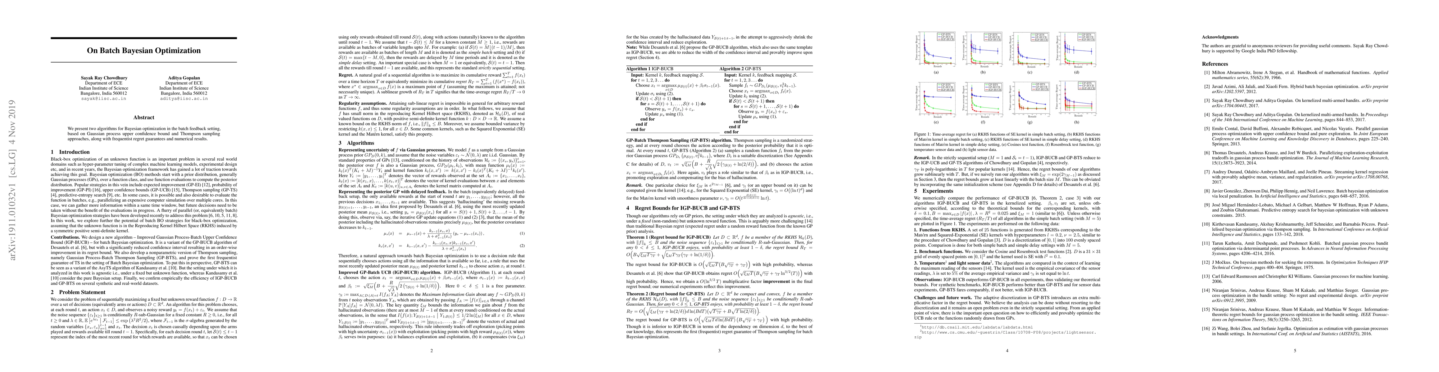 Summary: This paper introduces two batch Bayesian optimization algorithms—one based on Gaussian process upper confidence bounds and the other on Thompson sampling—providing both frequentist regret guarantees and empirical results to validate their performance.
