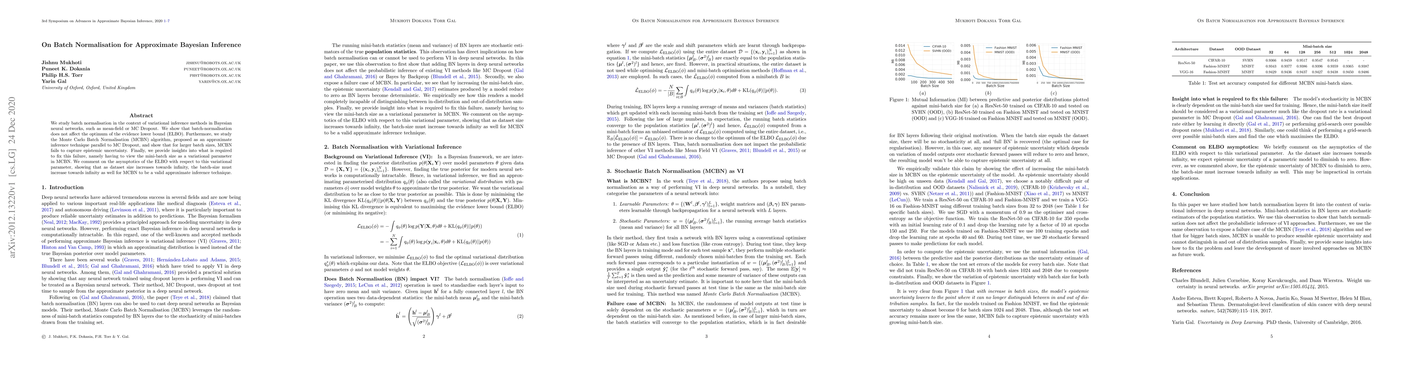 This paper investigates the impact of batch normalisation on variational inference in Bayesian neural networks, demonstrating that it does not alter the ELBO optimum. It also examines Monte Carlo Batch Normalisation (MCBN), revealing that it struggles to capture epistemic uncertainty for larger batch sizes, suggesting that treating mini-batch size as a variational parameter is necessary to correct this issue.