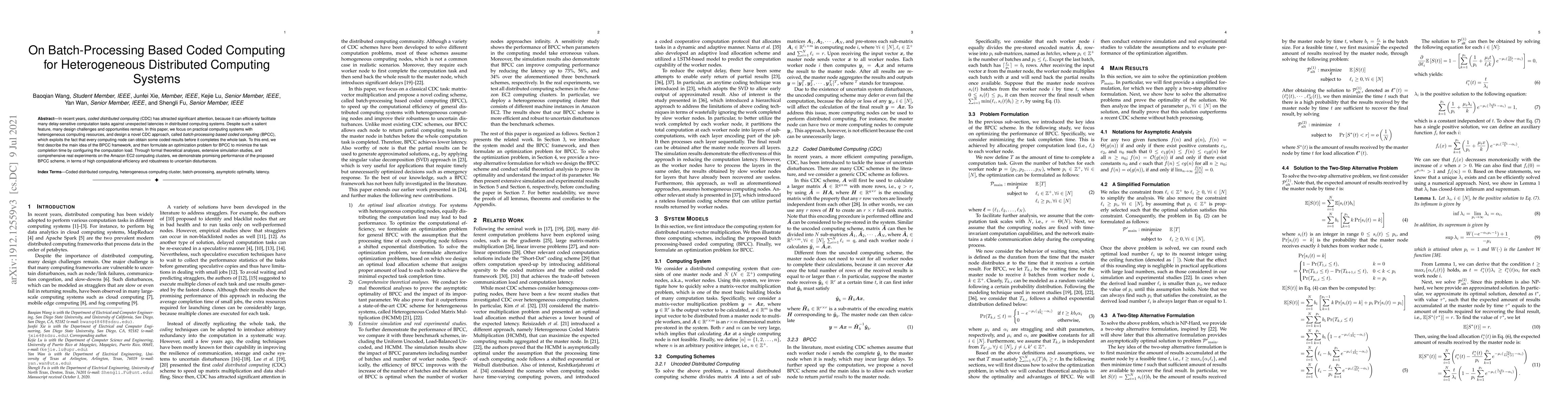 In recent years, coded distributed computing (CDC) has attracted significant attention, because it can efficiently facilitate many delay-sensitive computation tasks against unexpected latencies in distributed computing systems. Despite such a salient feature, many design challenges and opportunities remain. In this paper, we focus on practical computing systems with heterogeneous computing resources, and design a novel CDC approach, called batch-processing based coded computing (BPCC), which exploits the fact that every computing node can obtain some coded results before it completes the whole task. To this end, we first describe the main idea of the BPCC framework, and then formulate an optimization problem for BPCC to minimize the task completion time by configuring the computation load. Through formal theoretical analyses, extensive simulation studies, and comprehensive real experiments on the Amazon EC2 computing clusters, we demonstrate promising performance of the proposed BPCC scheme, in terms of high computational efficiency and robustness to uncertain disturbances.