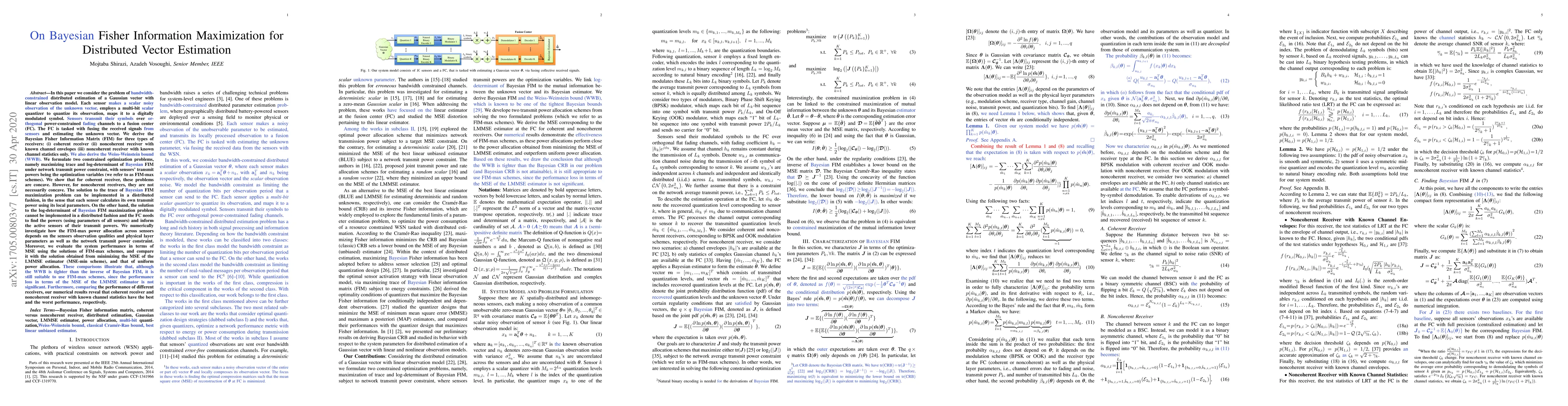 This paper investigates distributed estimation of a Gaussian vector using Bayesian Fisher Information Matrix (FIM) maximization under power constraints. It derives FIM for different receiver types and formulates optimization problems for trace and log-determinant FIM maximization, showing concavity for coherent receivers but not for noncoherent ones. The study compares FIM-max schemes with MSE-min and uniform power allocation, demonstrating minimal performance loss despite the Weiss-Weinstein bound being tighter.