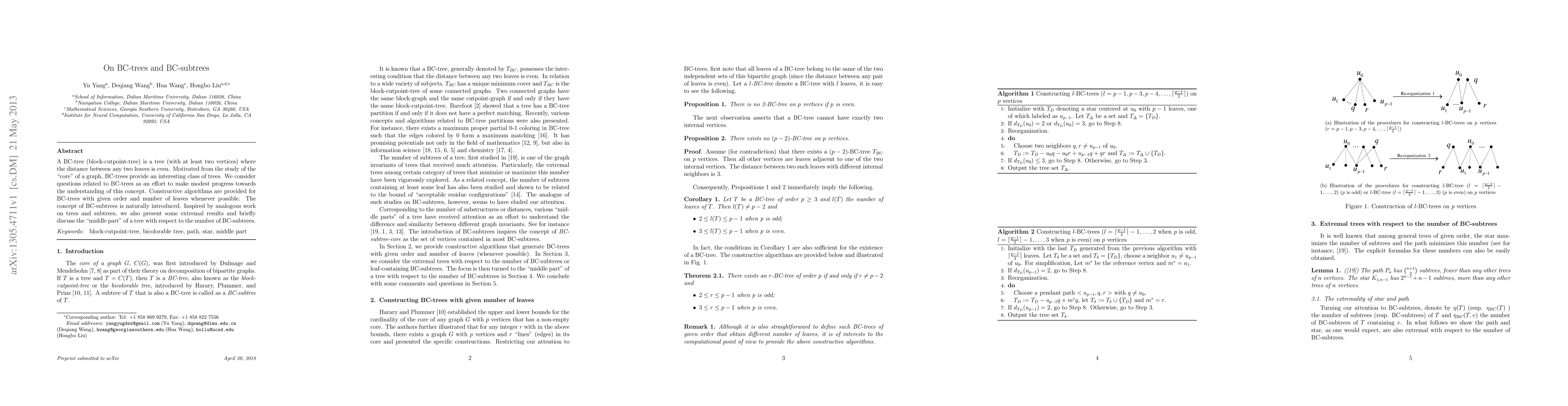 Summary: This paper explores BC-trees, a class of trees where the distance between any two leaves is even, and introduces BC-subtrees. It provides constructive algorithms for BC-trees and discusses extremal results, aiming to better understand the "middle part" of these trees in relation to BC-subtrees.