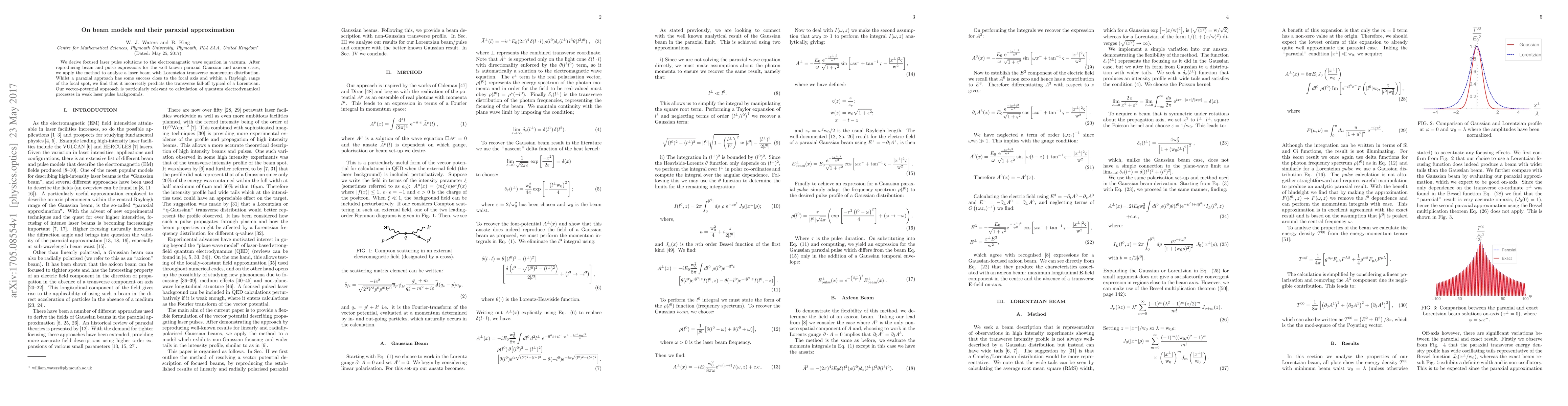 We derive focused laser pulse solutions to the electromagnetic wave equation in vacuum. After reproducing beam and pulse expressions for the well-known paraxial Gaussian and axicon cases, we apply the method to analyse a laser beam with Lorentzian transverse momentum distribution. Whilst a paraxial approach has some success close to the focal axis and within a Rayleigh range of the focal spot, we find that it incorrectly predicts the transverse fall-off typical of a Lorentzian. Our vector-potential approach is particularly relevant to calculation of quantum electrodynamical processes in weak laser pulse backgrounds.