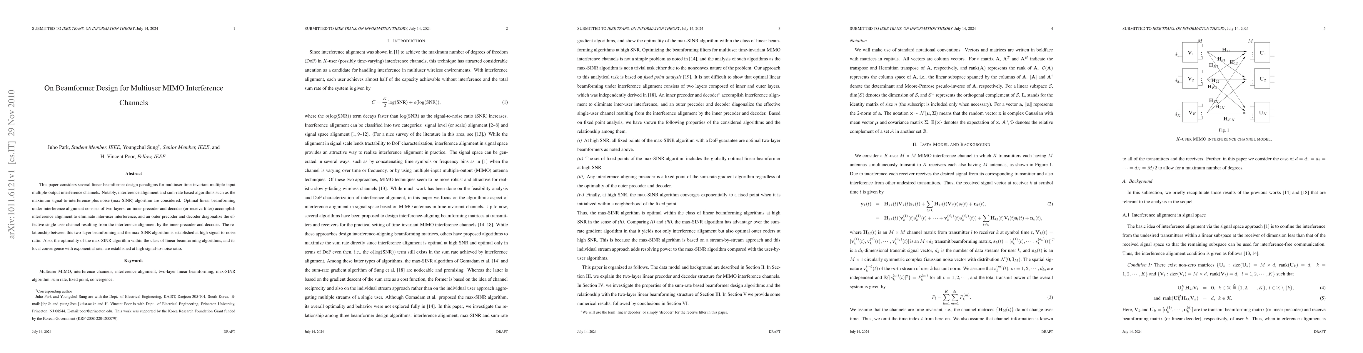 This paper explores linear beamformer design for multiuser MIMO channels, focusing on interference alignment and sum-rate algorithms. It establishes the relationship between two-layer beamforming and the max-SINR algorithm, proving the optimality and local convergence of the latter at high signal-to-noise ratios.