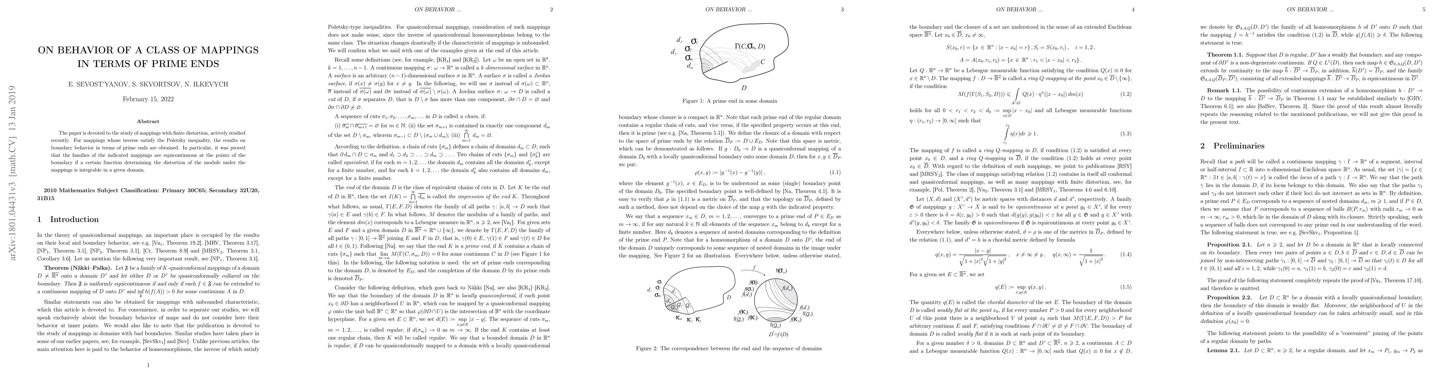 This paper investigates mappings with finite distortion, proving equicontinuity at boundary points if a distortion-determining function is integrable, and explores the boundary behavior in terms of prime ends for mappings satisfying the Poletsky inequality.