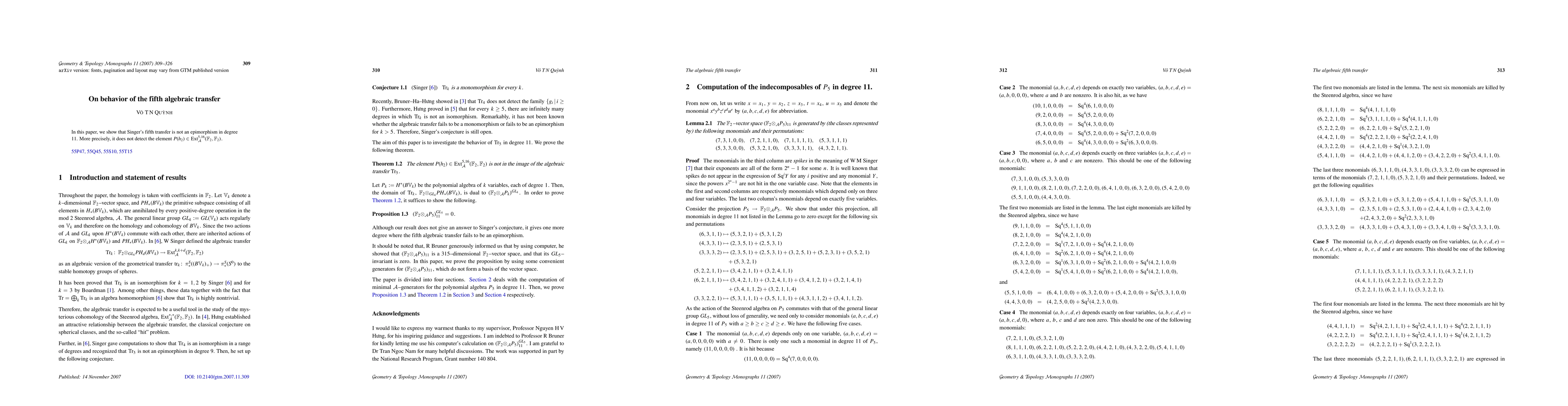Summary: This paper demonstrates that Singer's fifth algebraic transfer fails to be an epimorphism in degree 11, specifically failing to detect the element P(h_2) in Ext_A^{5,16}(F_2,F_2).