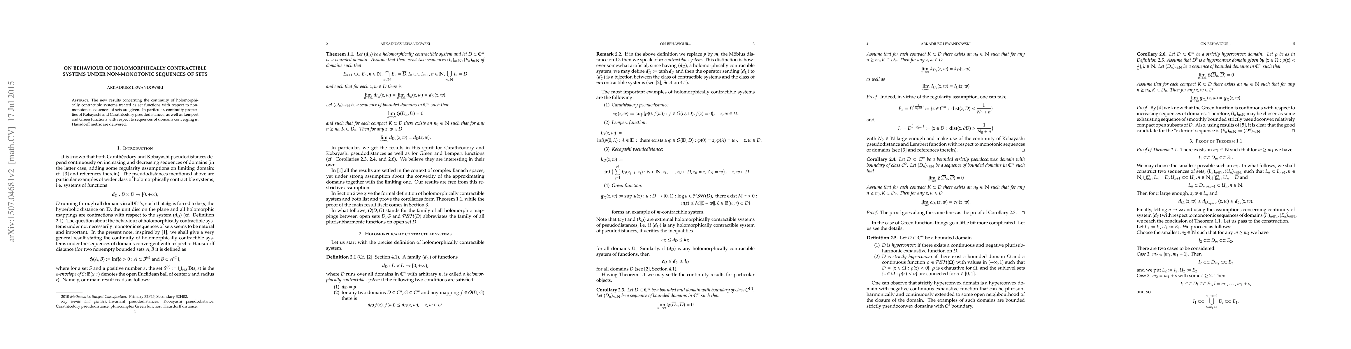 The new results concerning the continuity of holomorphically contractible systems treated as set functions with respect to non-monotonic sequences of sets are given. In particular, continuity properties of Kobayashi and Carath\'eodory pseudodistances, as well as Lempert and Green functions with respect to sequences of domains converging in Hausdorff metric are delivered.