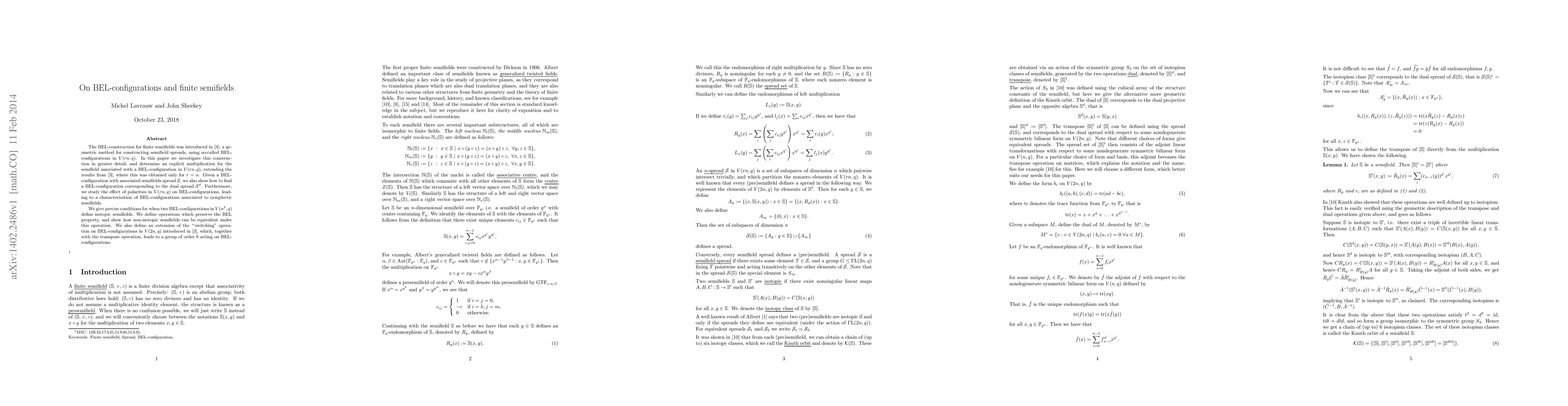 The paper investigates BEL-configurations in projective spaces using geometric methods, extending previous work on semifield spreads and providing explicit multiplication for associated semifields.